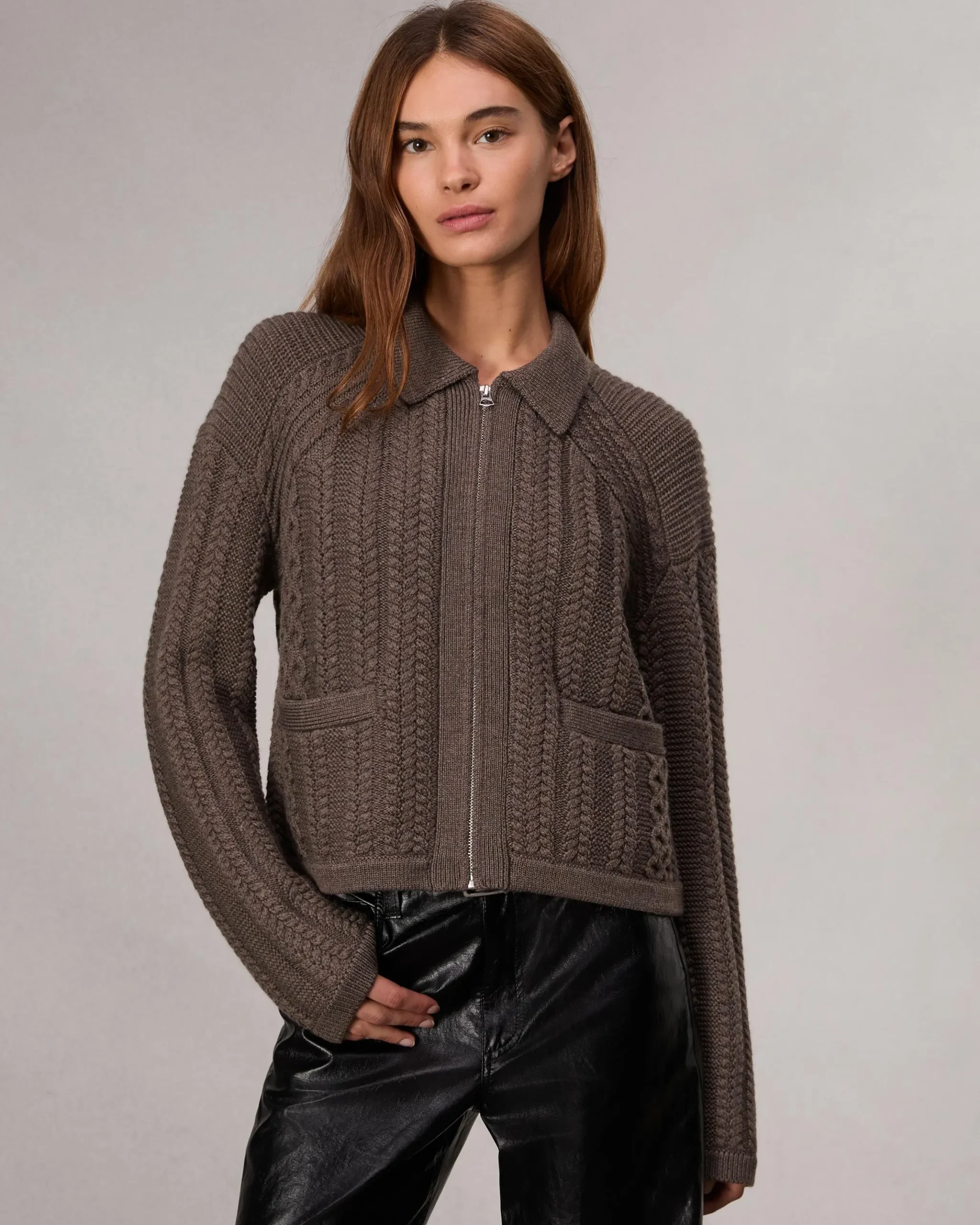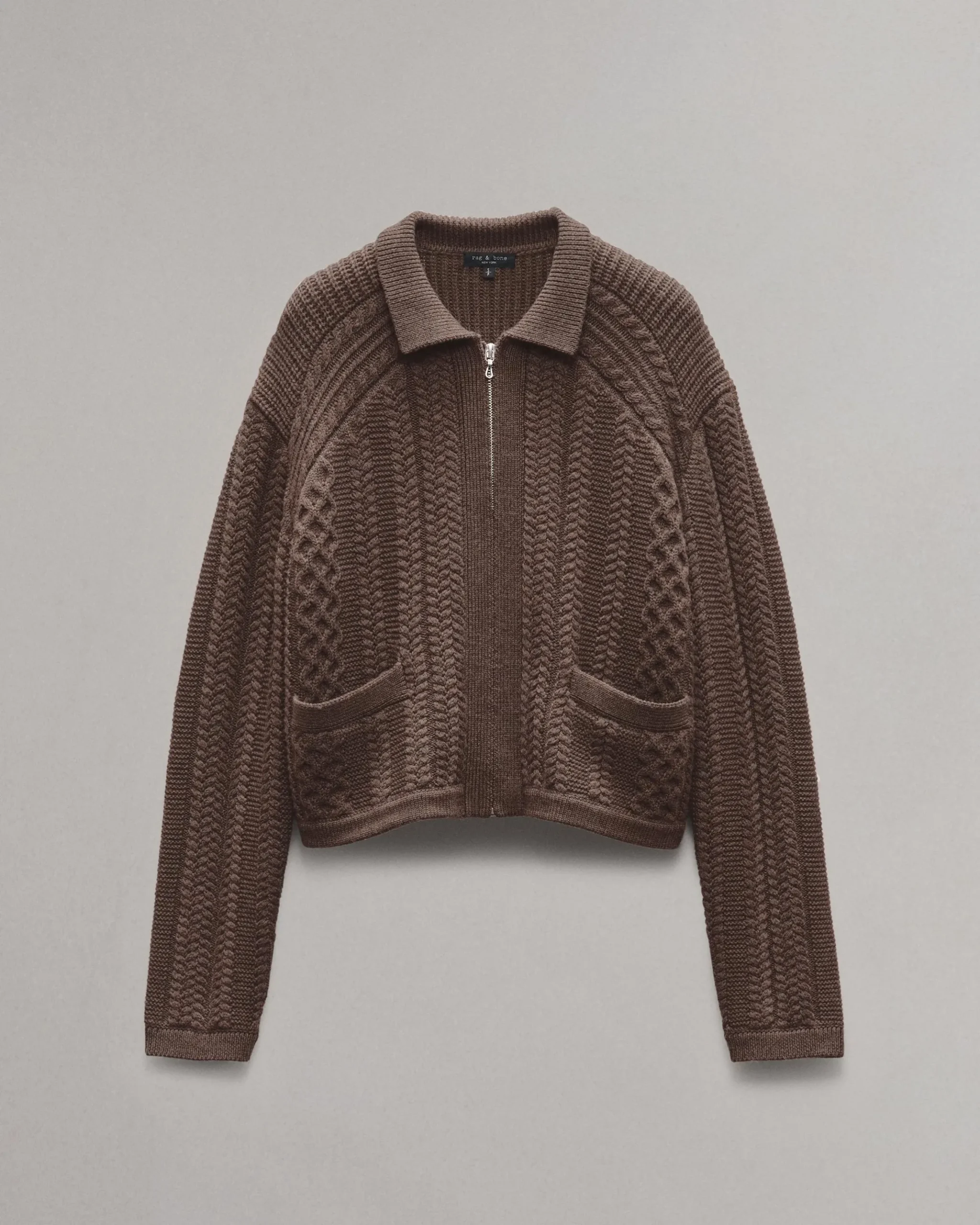 Crafted from cable-knit merino wool that’s ultra-soft and insulating, this zip cardigan sweater is perfect for transitional weather. Its relaxed, slightly cropped fit makes it an effortless top when worn alone or an easy third piece when layered like a jacket.
