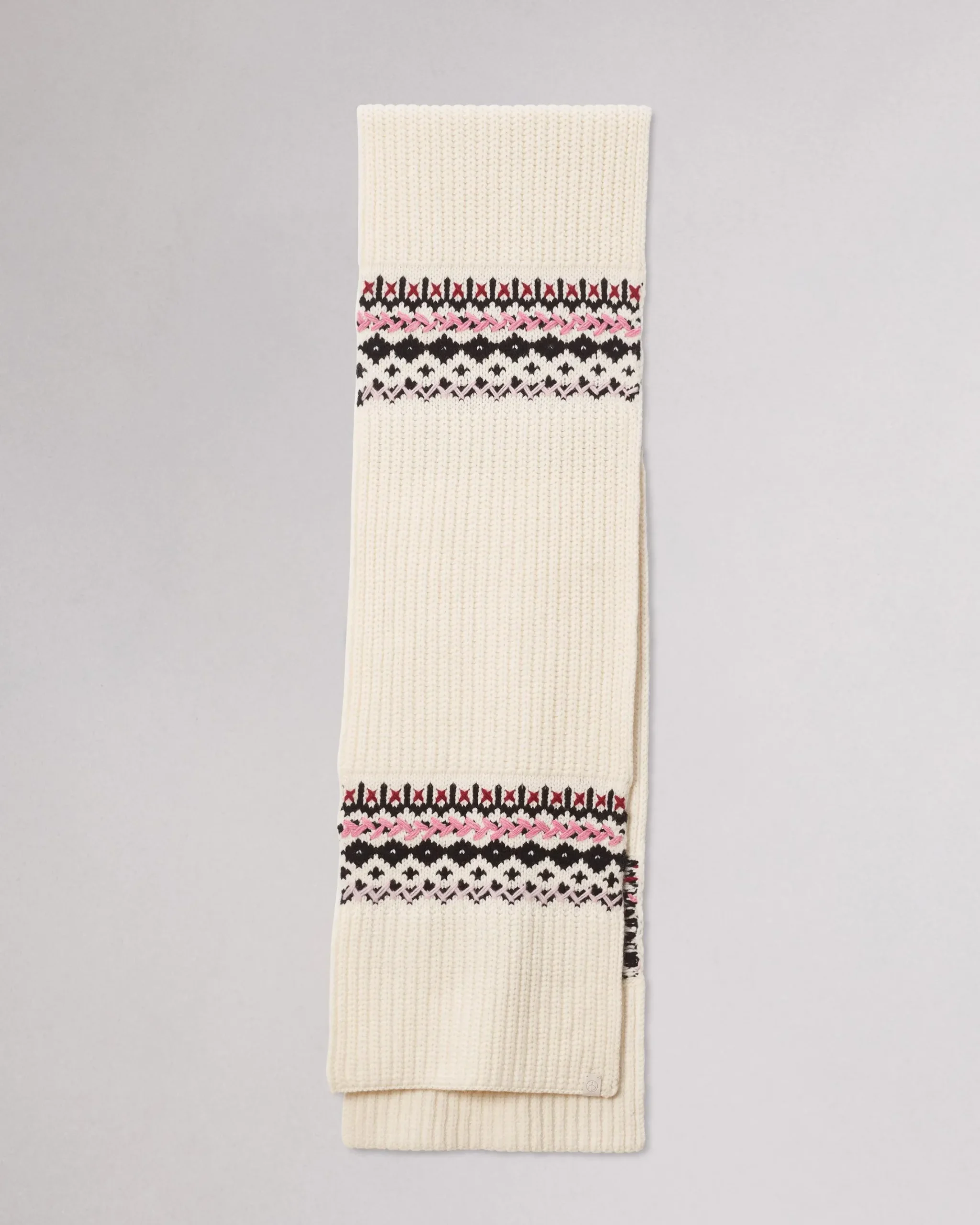 The Leigh Scarf. Knit with wool in a dynamic Fair Isle stitch, ideal for the throes of winter. The perfect combo when paired with its matching beanie or sweater.