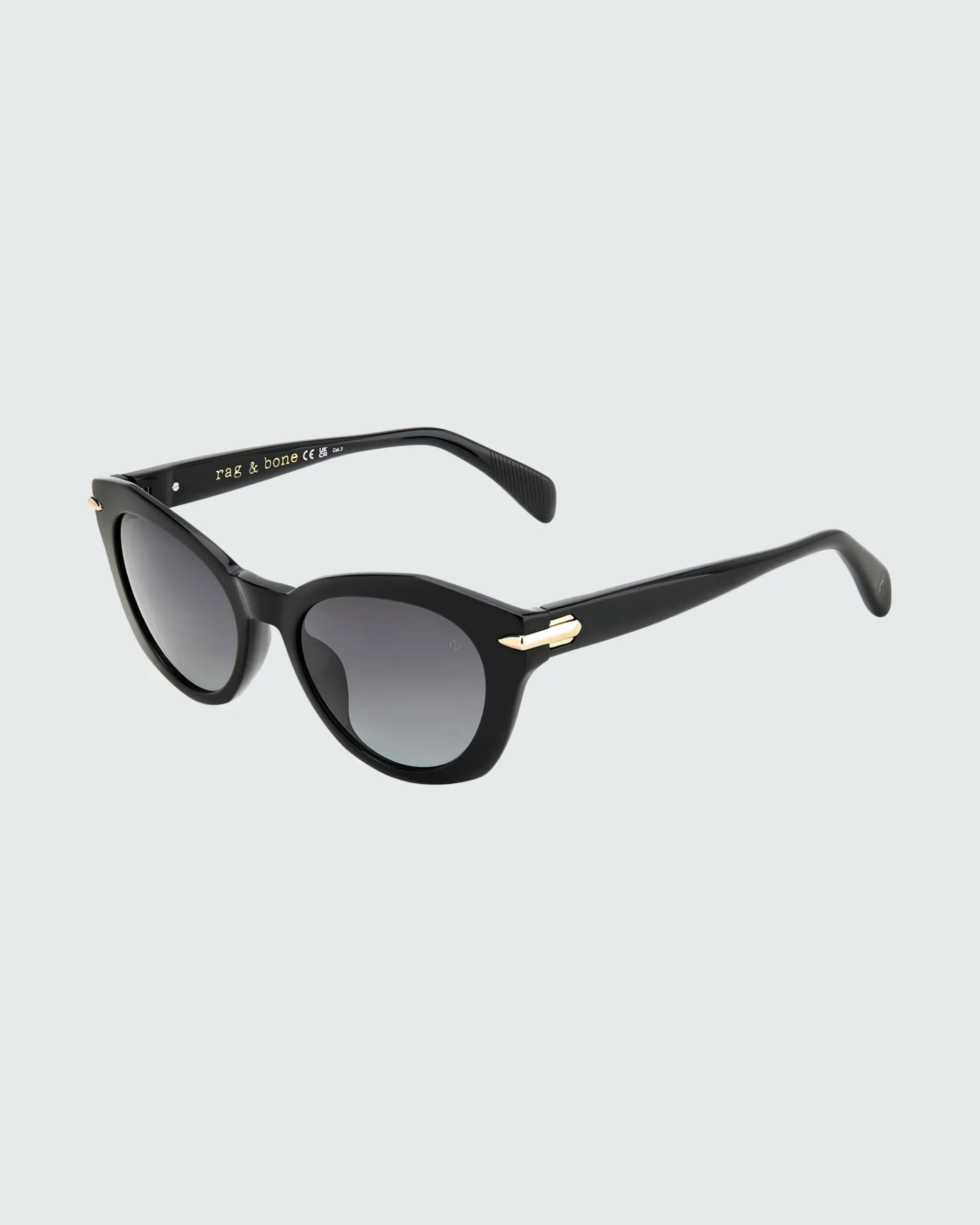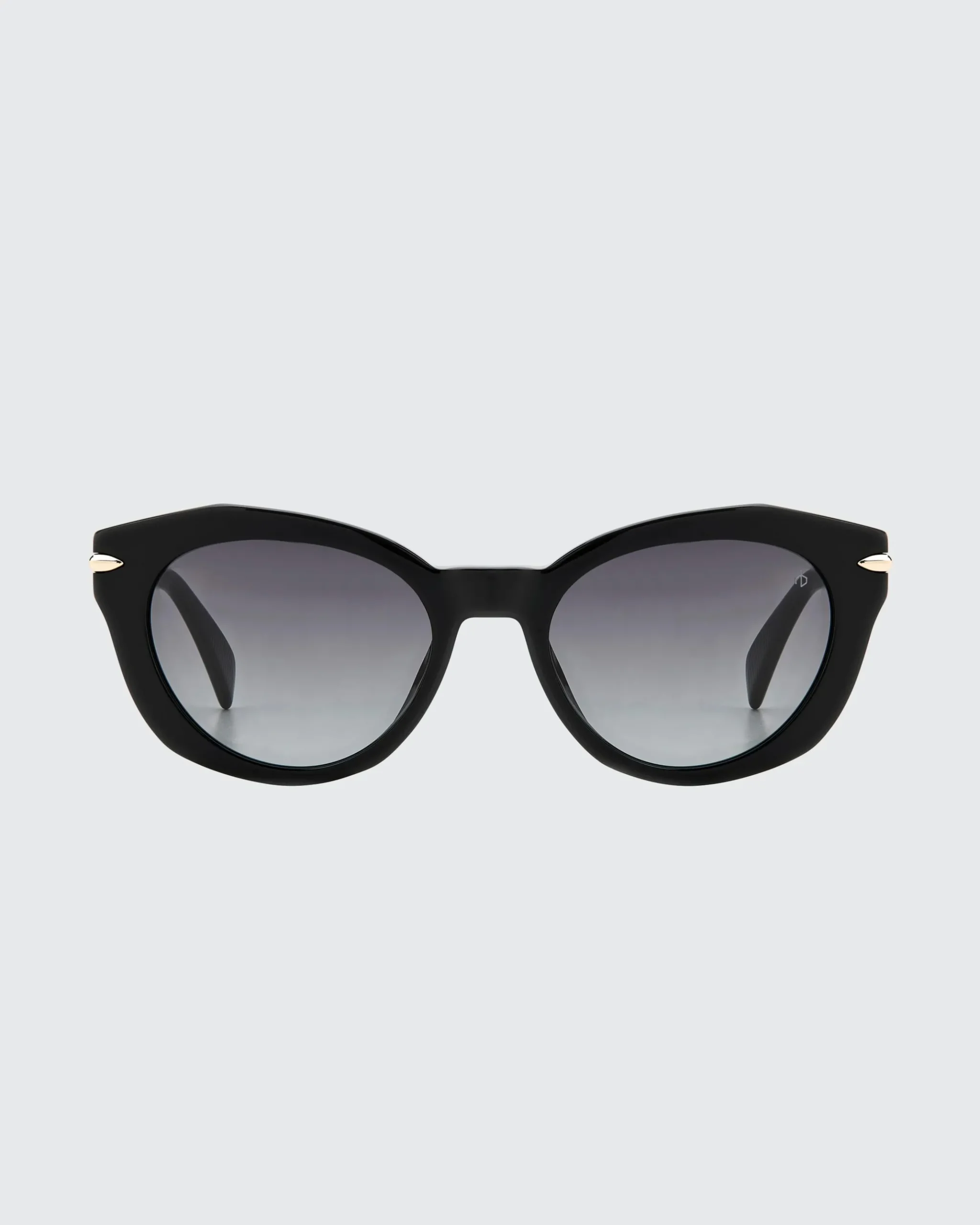 A cat eye silhouette with an acetate frame and 100% UV protection.