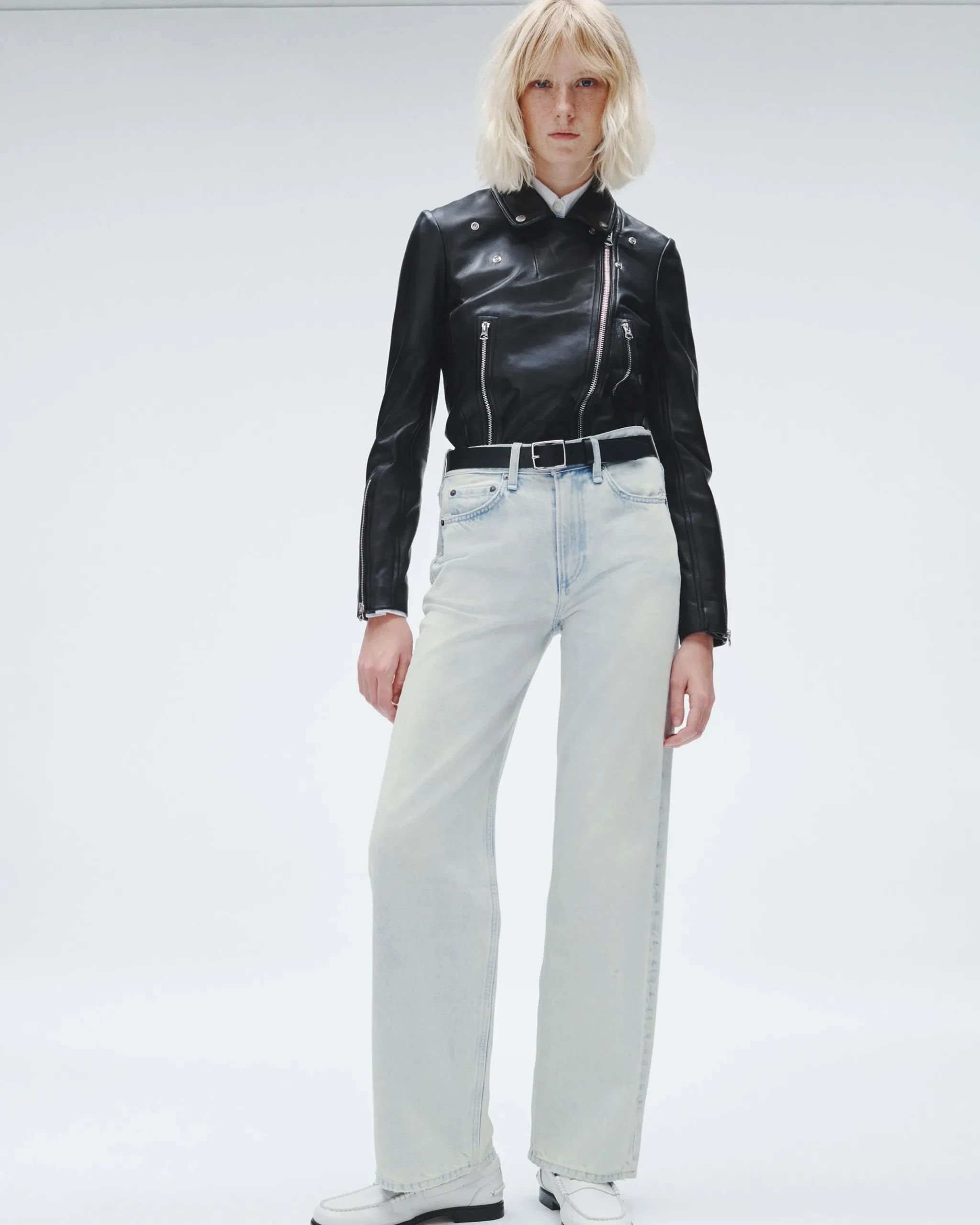 100% CottonLightweight rigid,light indigoMachine wash cold inside out with like colors; do not use bleach; hang to dry; do not iron; color transfer may occurHidden center front zipper, dagger tack button, washer rivetEggshell rag & bone embroidery with a clean finished hemZip button closureFive- pocket silhoutte Imported