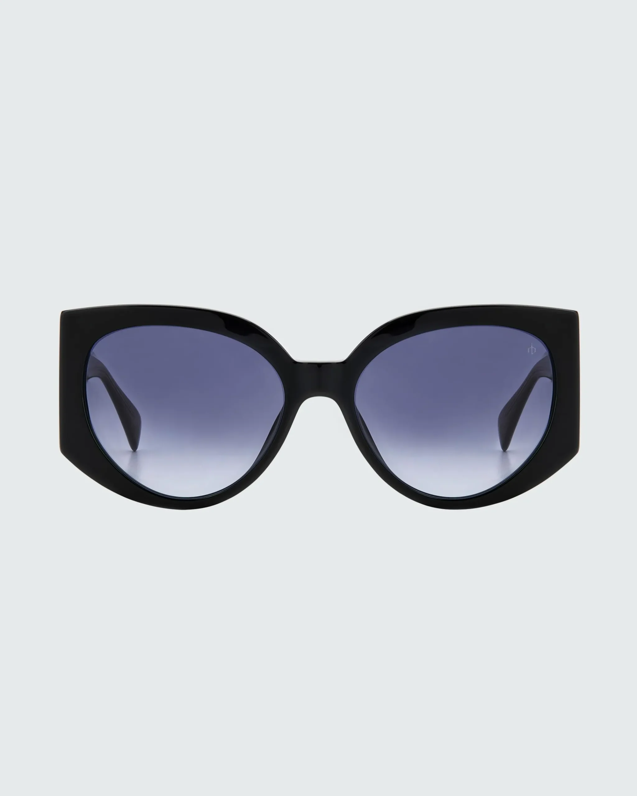 A cat eye silhouette with an eco acetate frame and 100% UV protection.