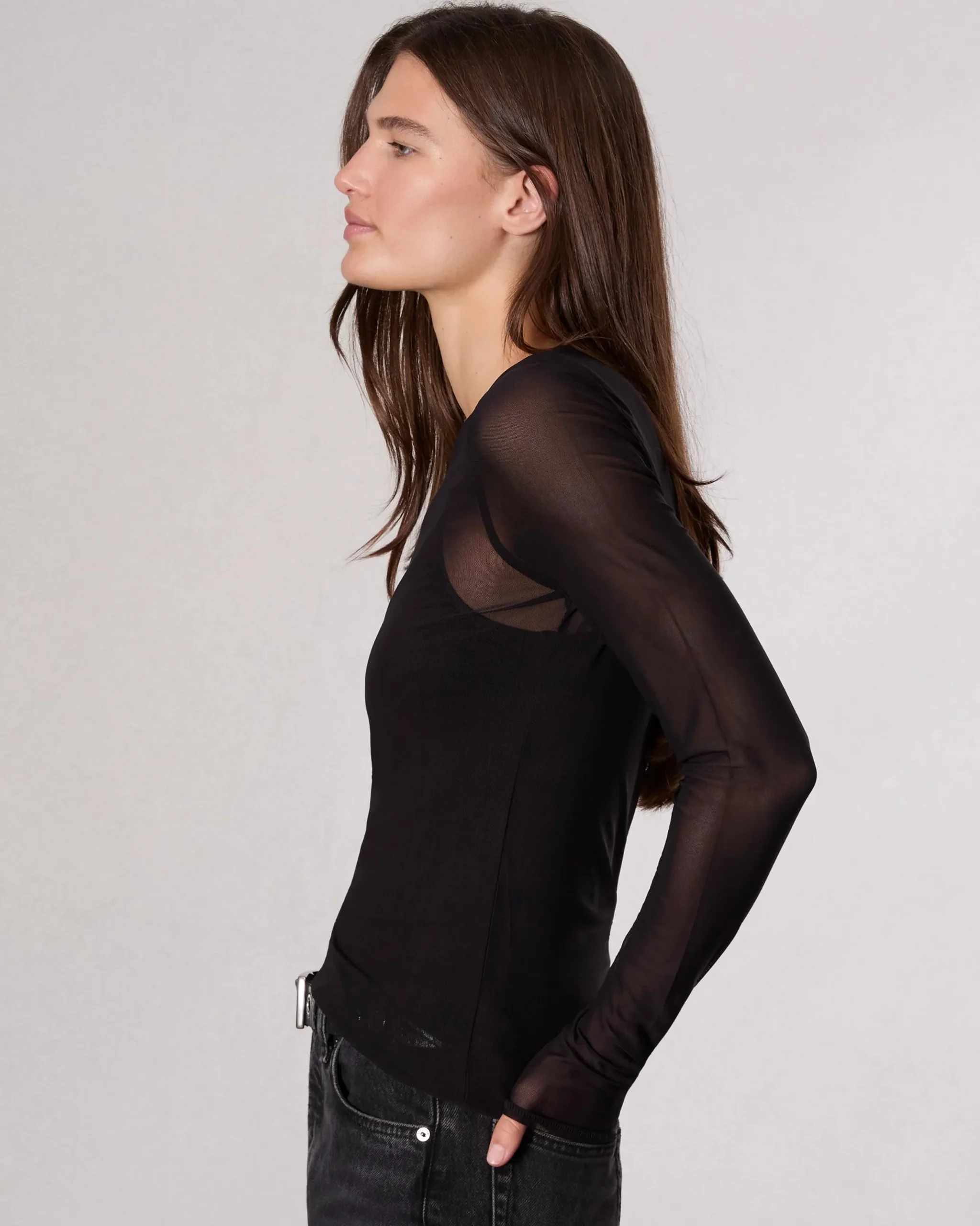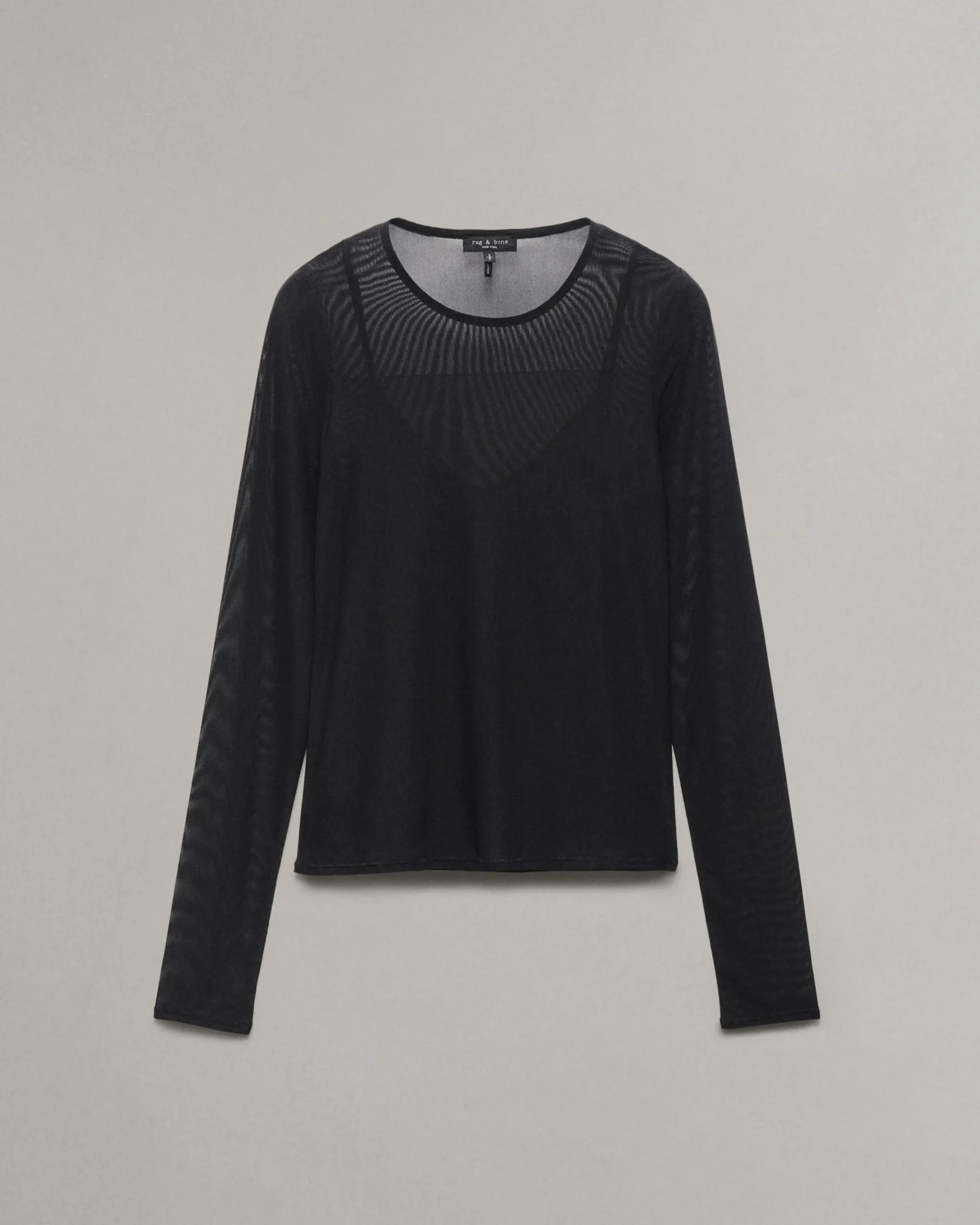This fitted long-sleeve T-shirt combines a sheer, stretch mesh overlay with a detachable cami top, pre-layered to perfection.