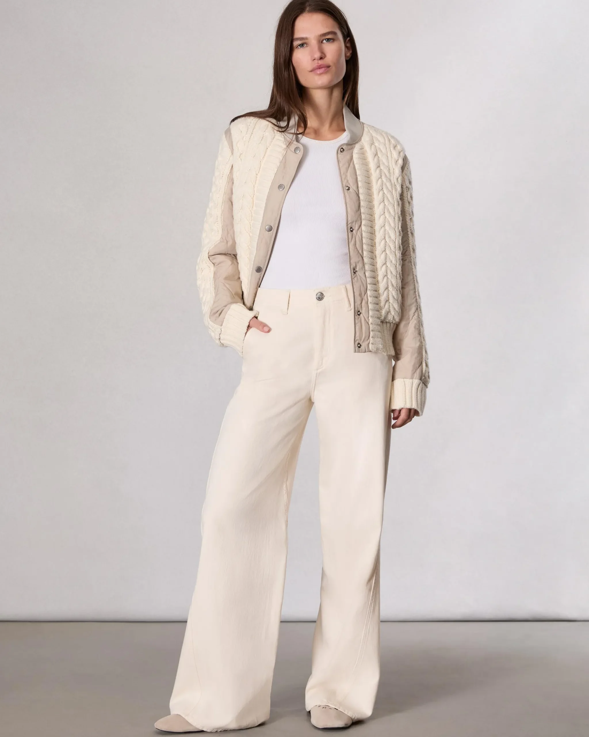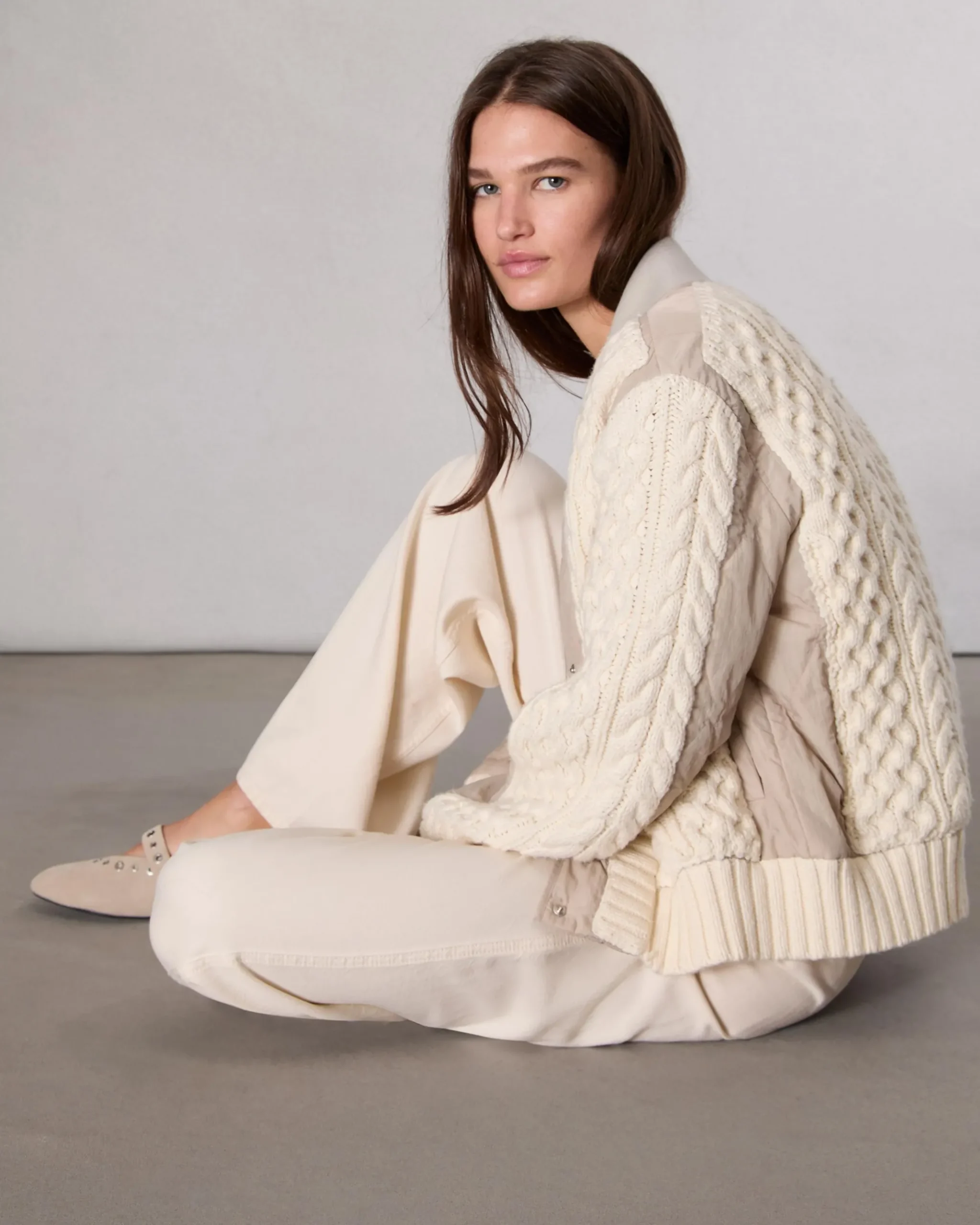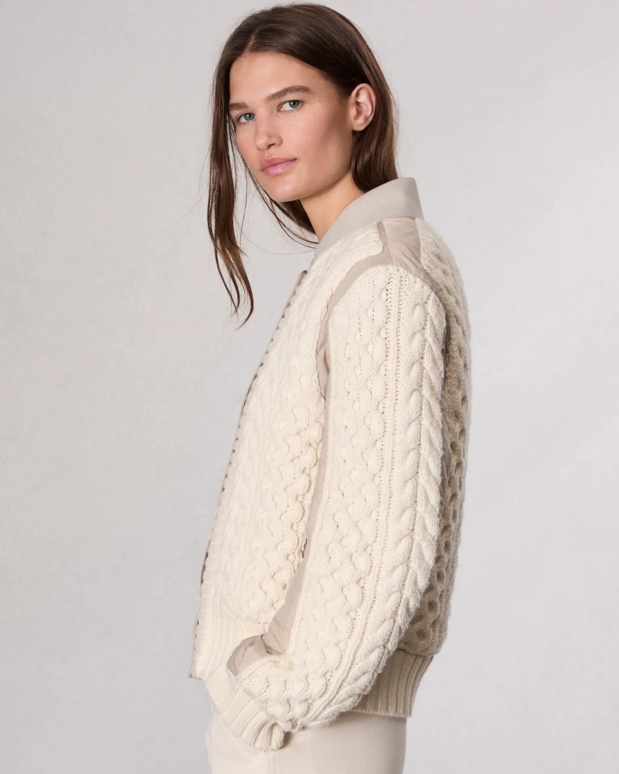 We reimagined our classic bomber jacket as a modern fusion between a cable-knit sweater and a quilted nylon liner. Detailed with ribbed trims, side pockets, and snaps up the front, the hip-length style is polyfilled for additional warmth.