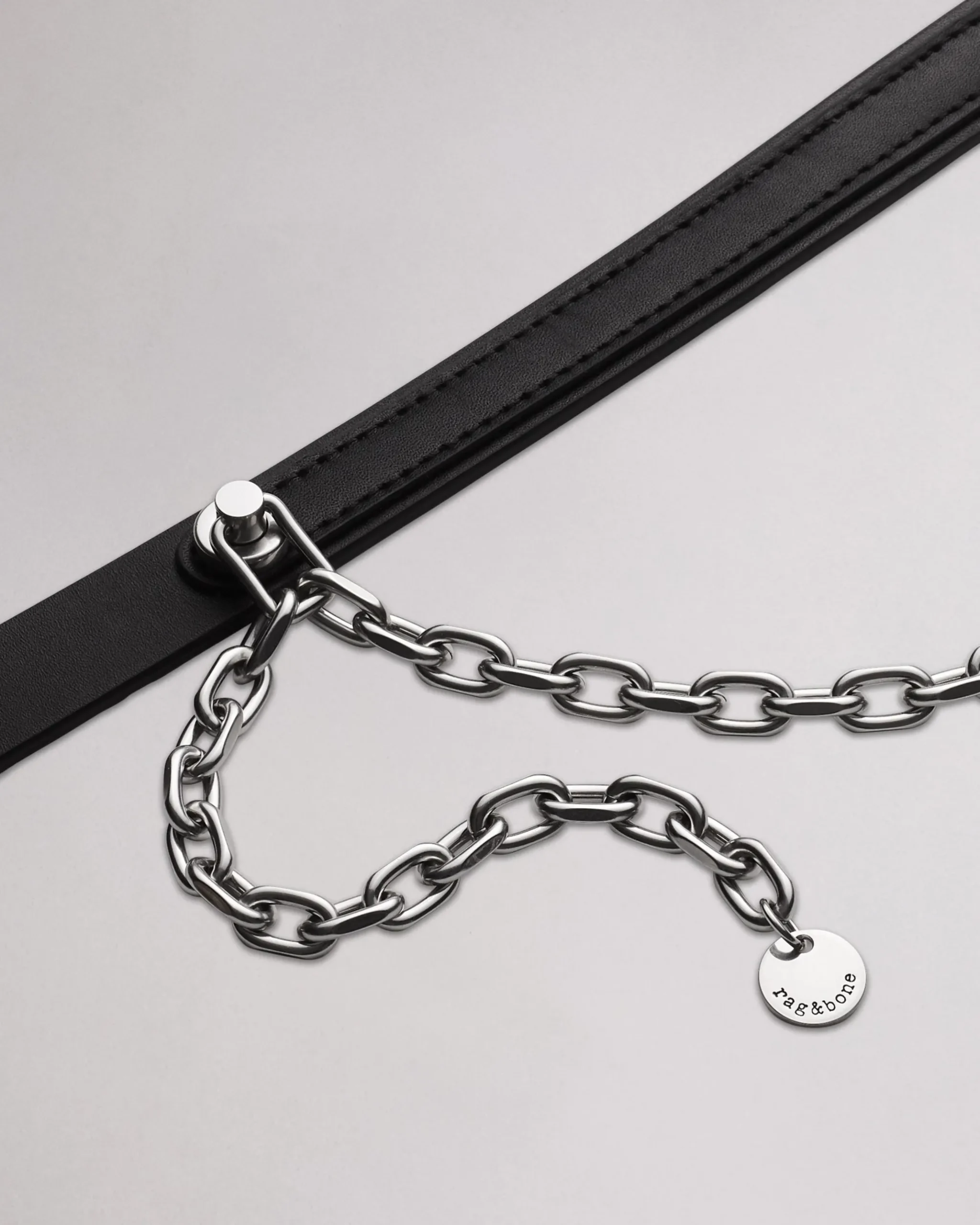 The Mari. Draped with a chain for an added edge, this thin belt is cut from smooth leather.