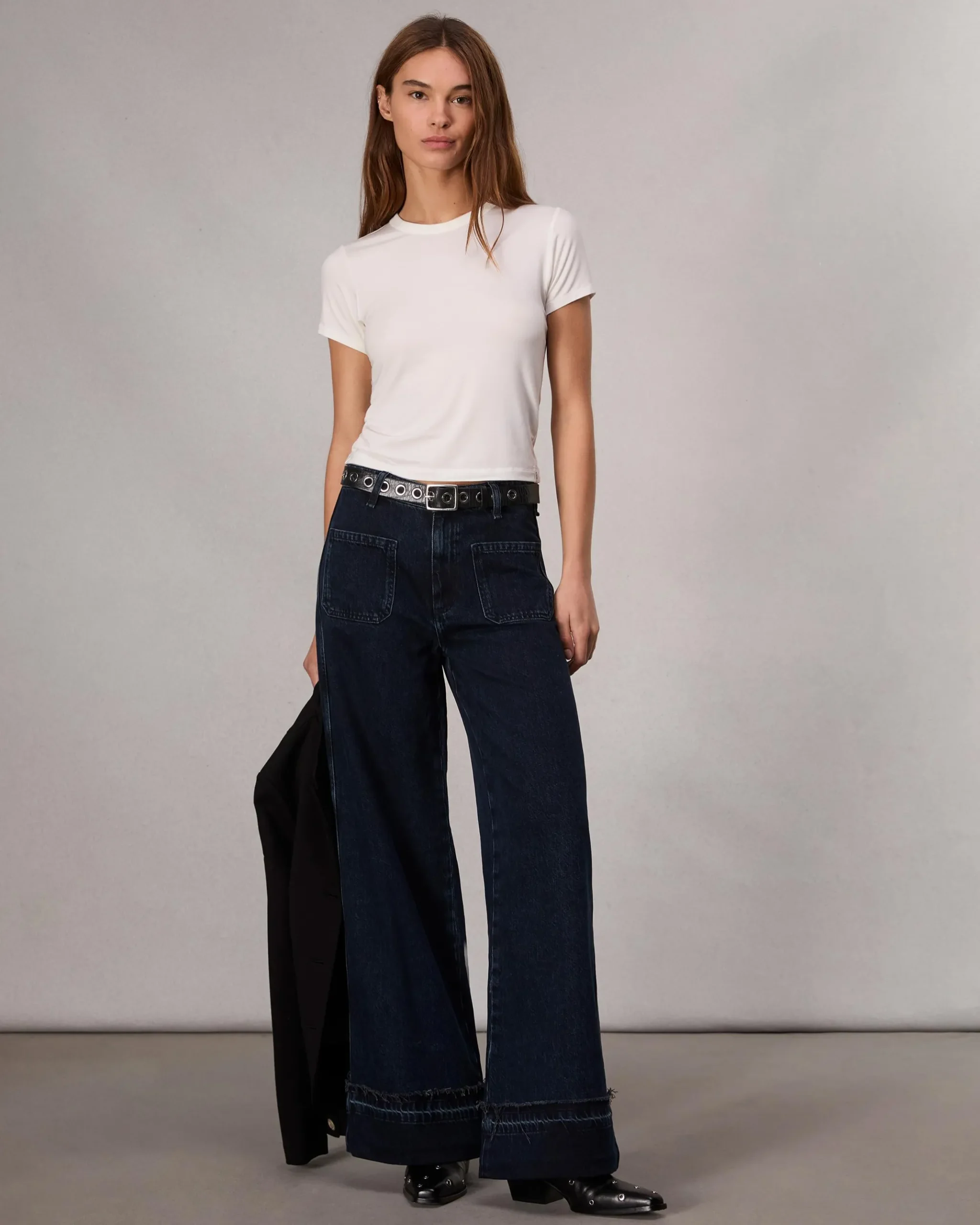The Marina. These ultra-wide-leg high-rise jeans are finished with patch pockets and hems that were released, then cuffed, creating their unique look. Crafted from drapey, super-soft Lightweight Rigid denim that gets even more comfortable with every wear. In Elenna, a blue-black indigo wash.