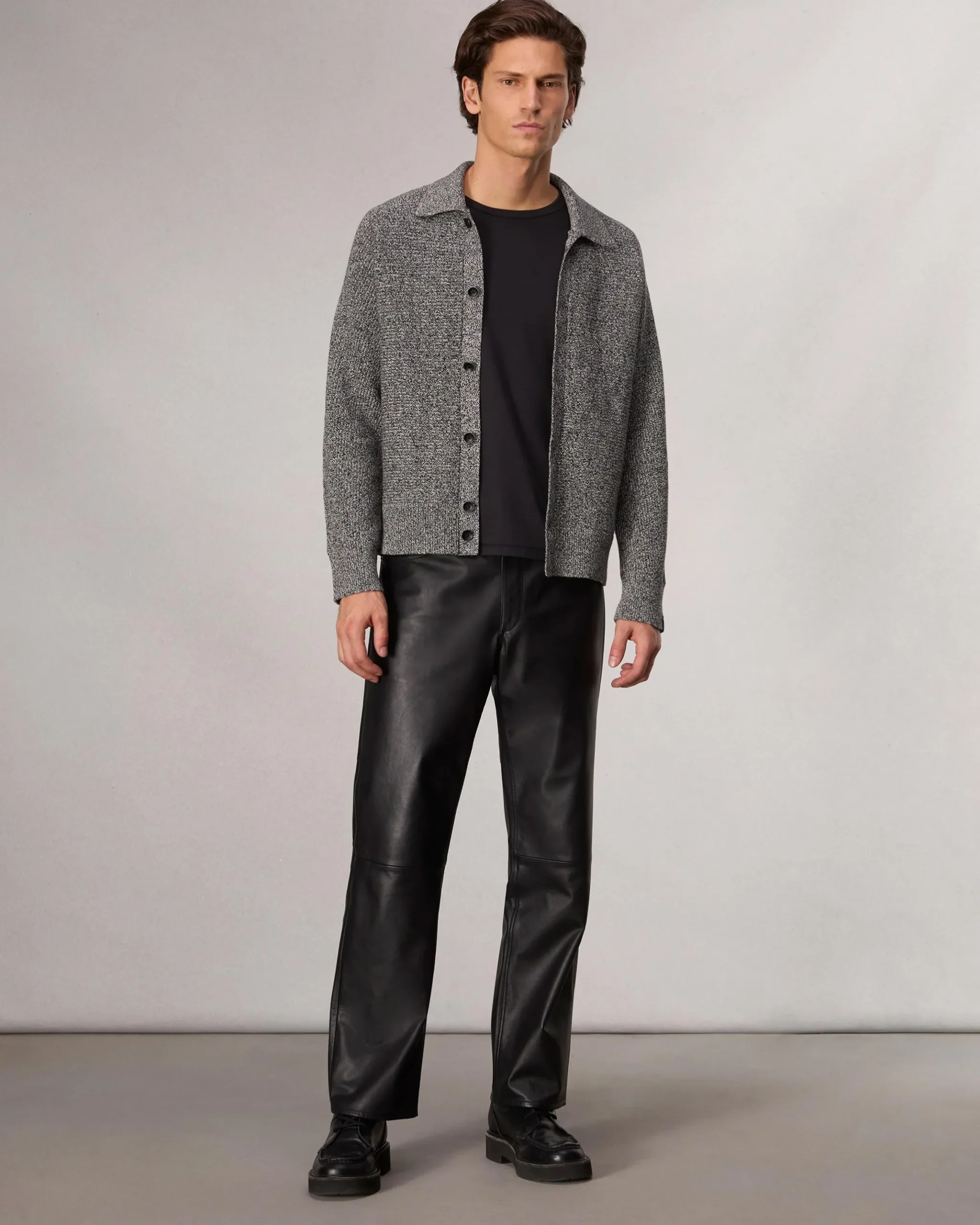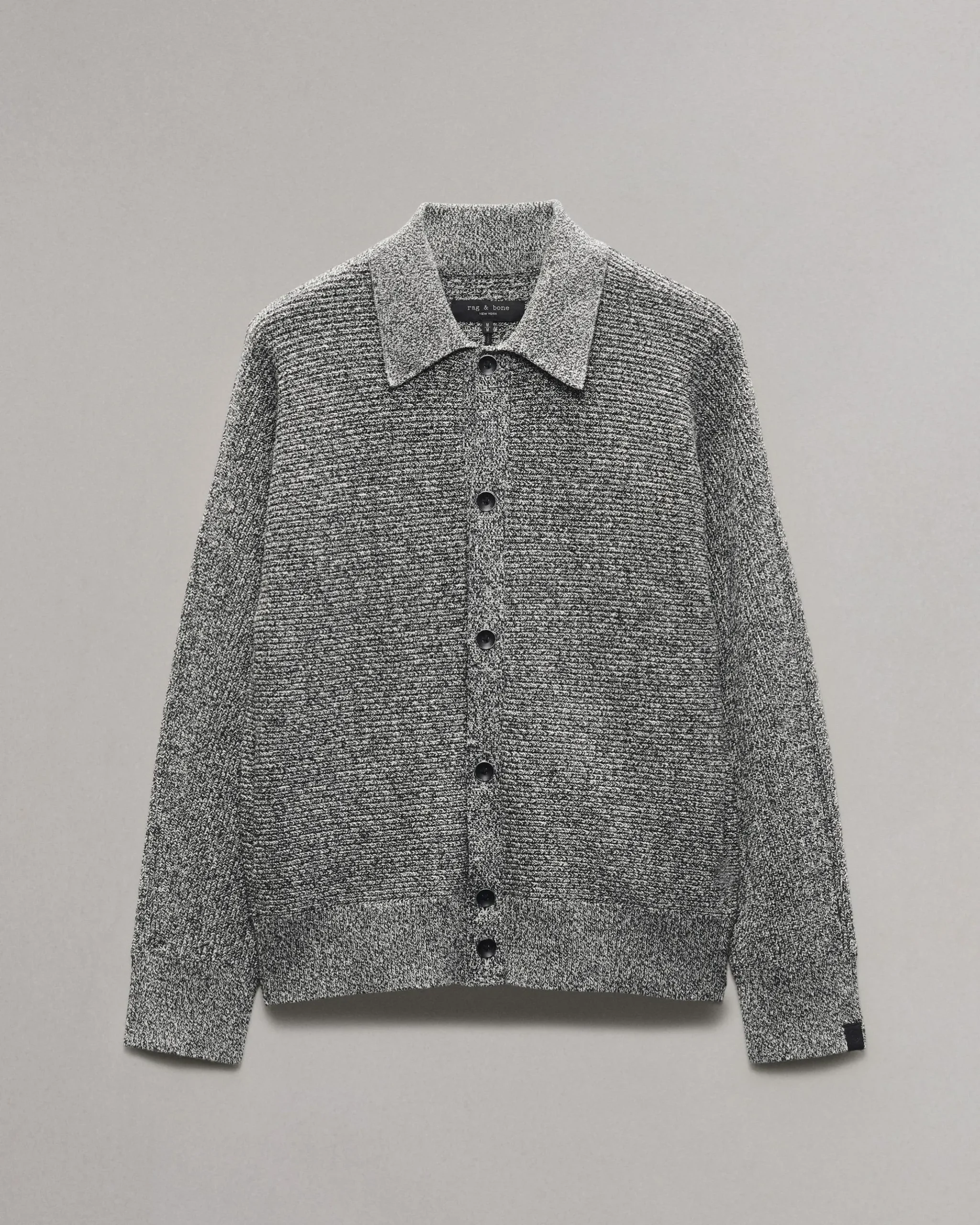 Two distinct colors of organic cotton-blend yarn are knit together to give this workwear-inspired cardigan sweater its marled texture and dimension.