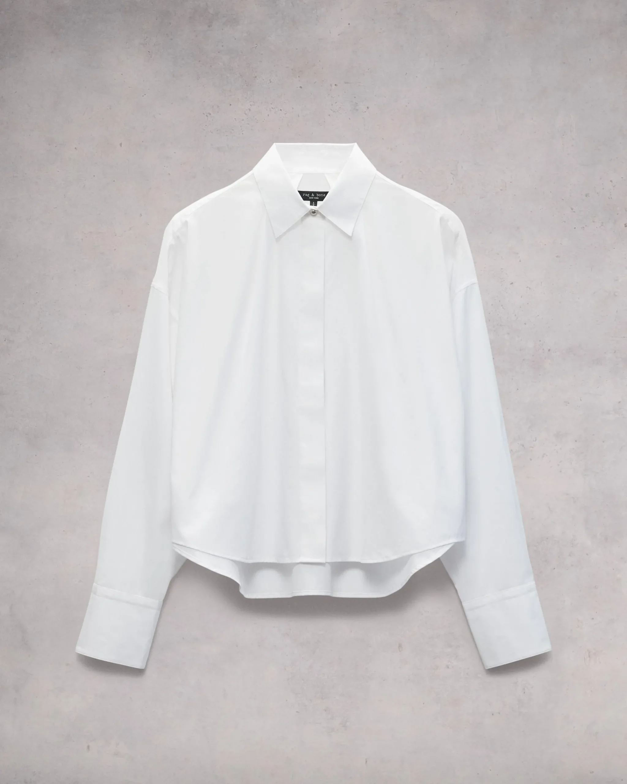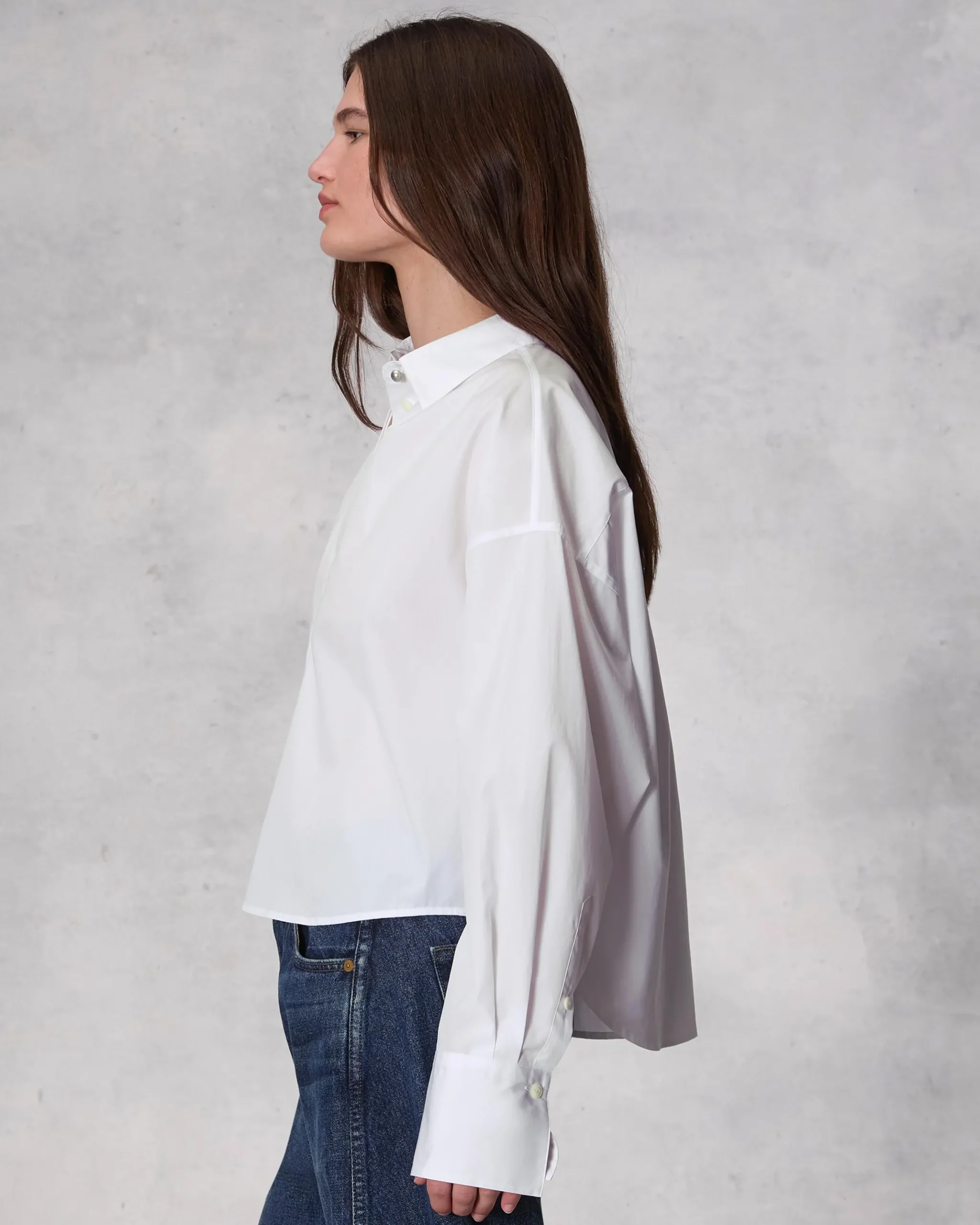 The Martha. Crafted in our signature cotton poplin for the ultimate wardrobe staple. Detailed with a back knife pleat to achieve the perfect relaxed crop fit, this long sleeve style features a hidden button placket for a clean finish and a silver-tone dome button at the top.
