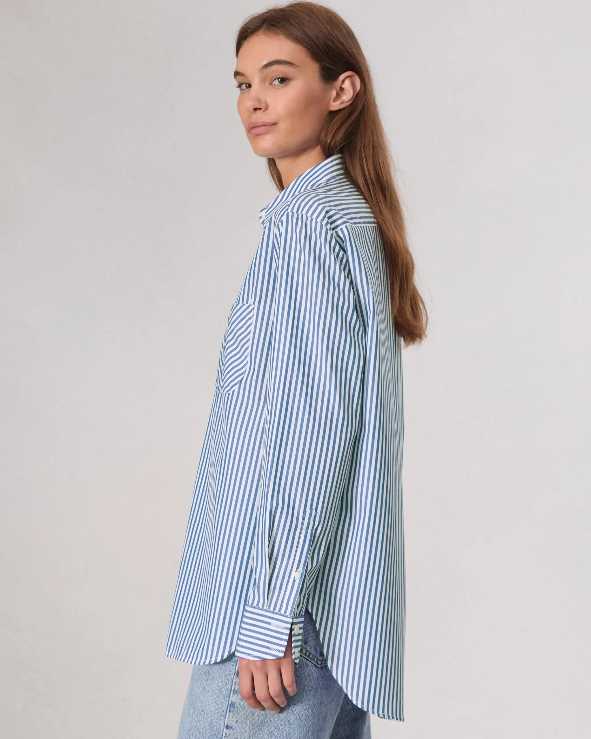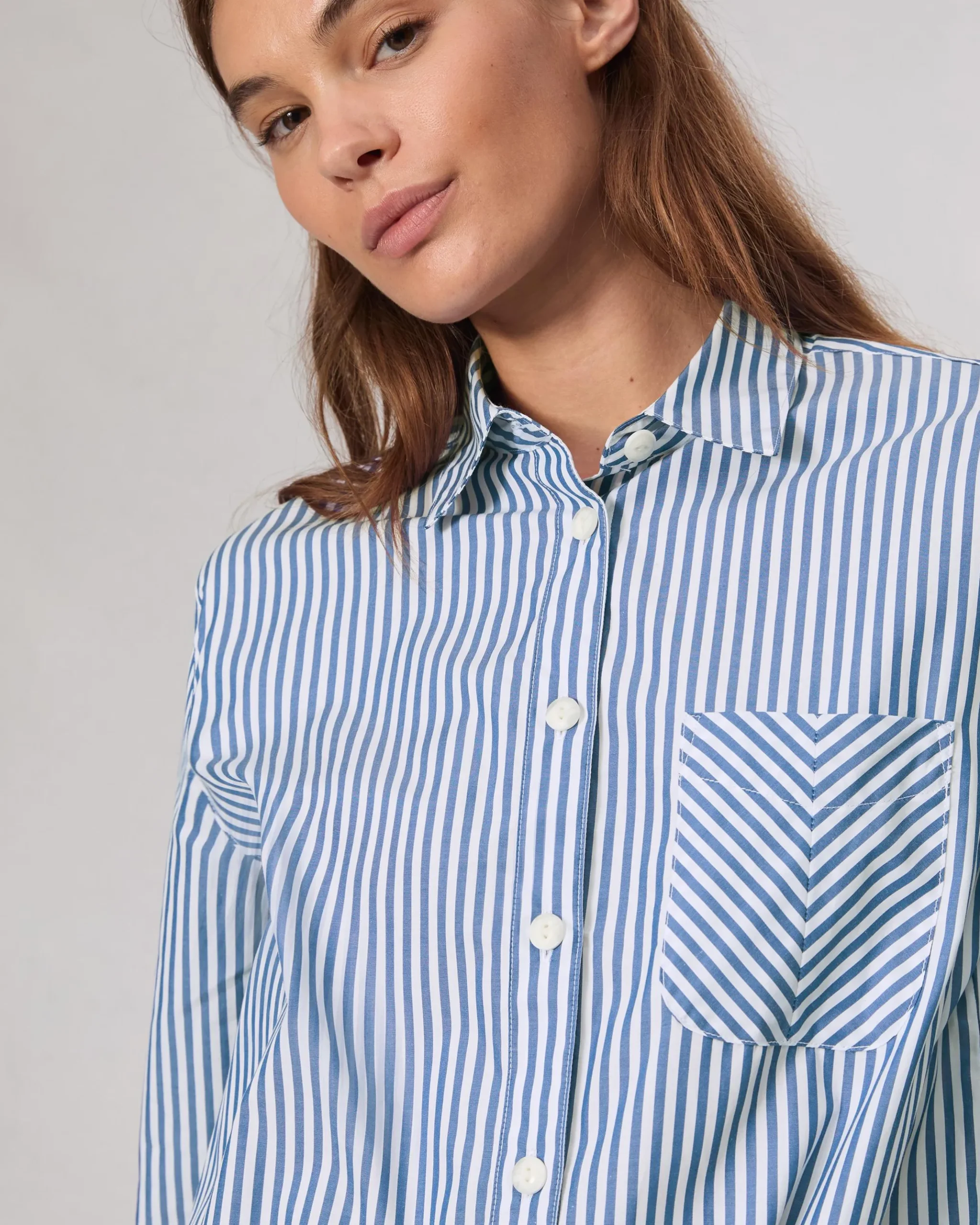Timeless. Authentic. Iconic. One of the building blocks of a perfect wardrobe.A true wardrobe staple, this poplin button down Icon is a classic, perfected. Featuring banker stripes and a chevron front pocket detail for added dimension. Subtle gathering around the cuffs gives this traditionally masculine shirt a subtly feminine touch. Pairs perfectly under a sweater-vest or military jacket. Crafted from 100% cotton with a relaxed fit.