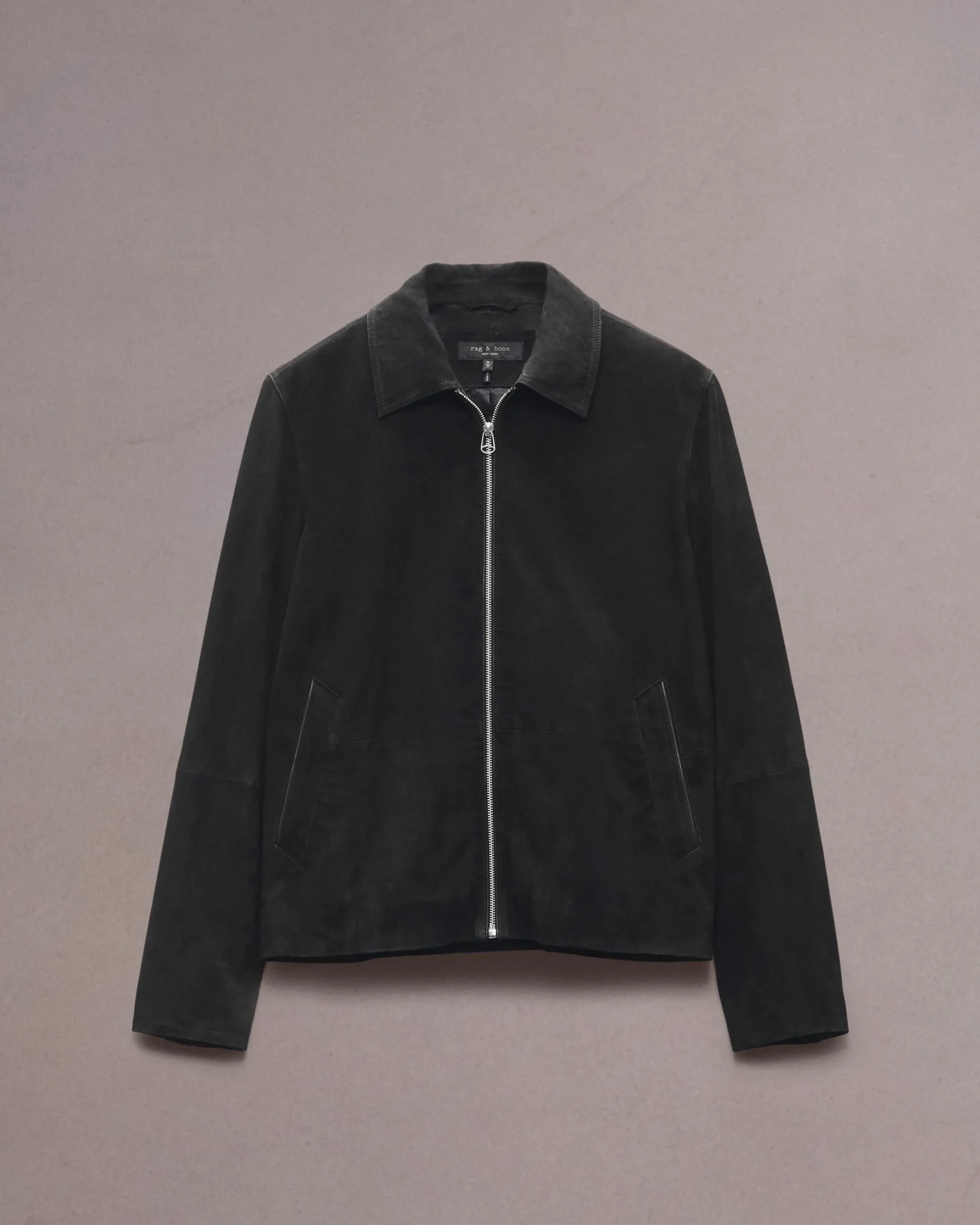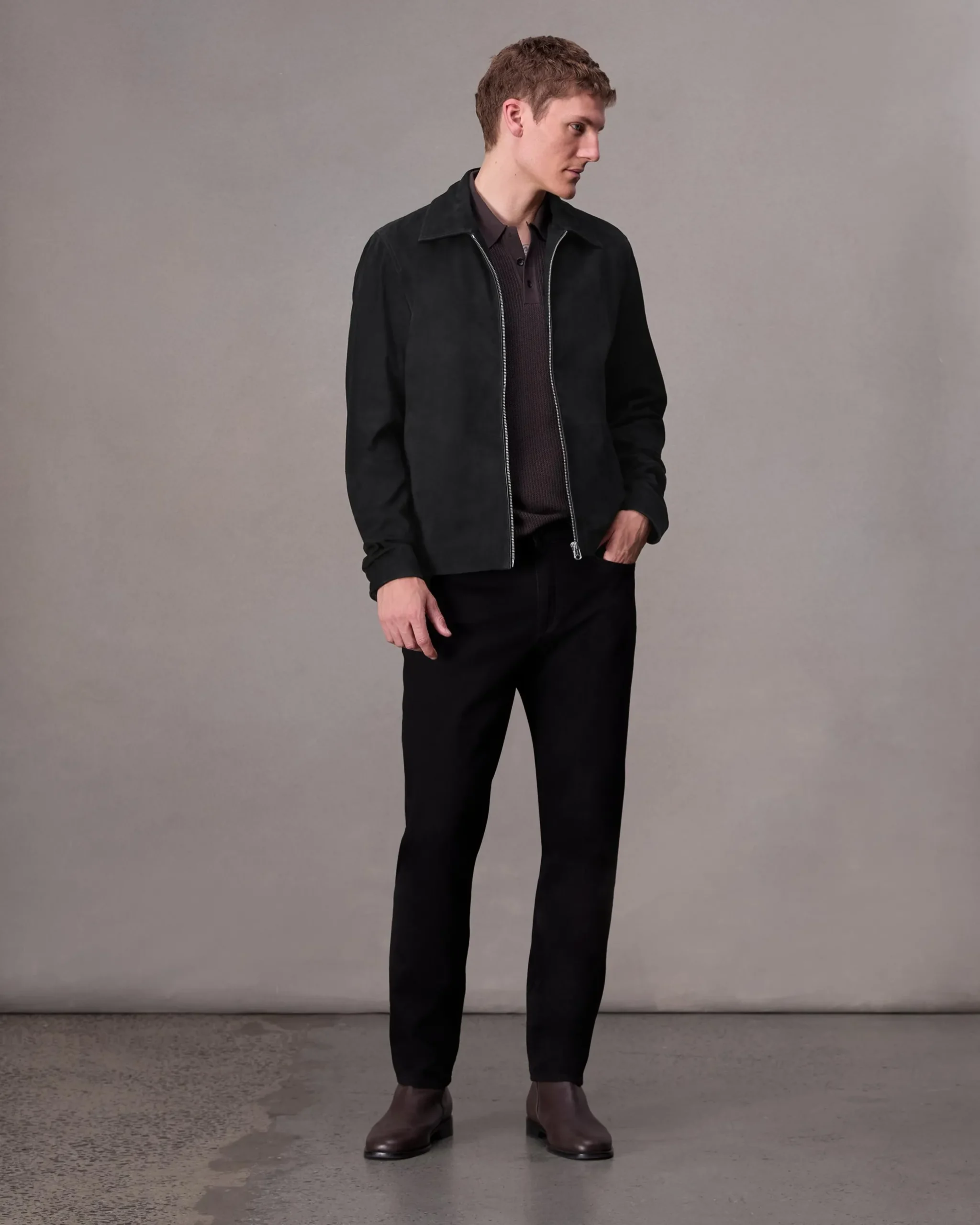 The Melrose. A pared-back classic. This straight-fitting style is detailed with a pointed collar, snap cuffs and a zip front closure, all in velvety soft suede.