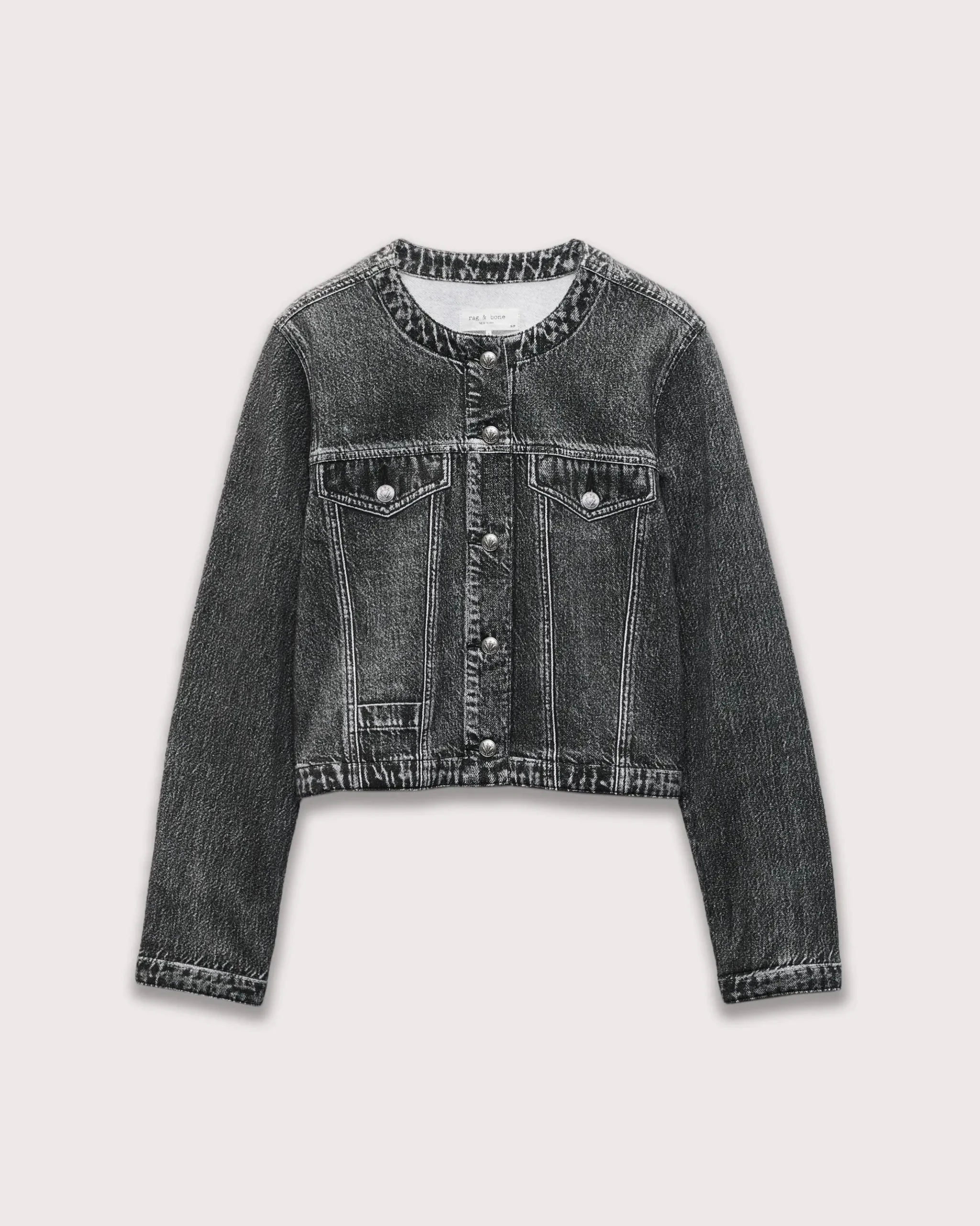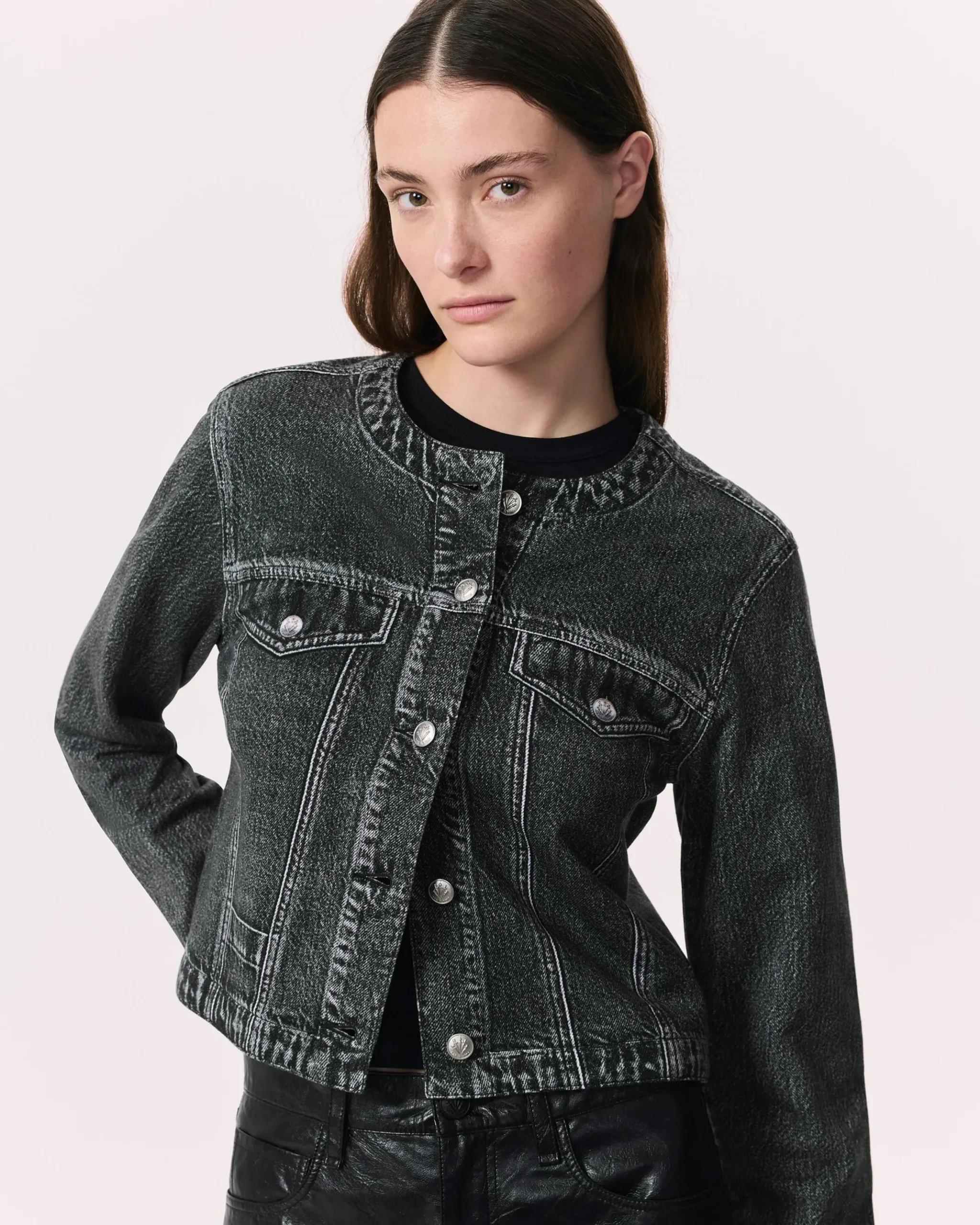 The Cora. A reimagining of the collarless jacket. Crafted in Miramar, a super soft cotton terry that looks like denim, but feels nothing like it. In Washed Black with printed rivets, seams, and pockets.