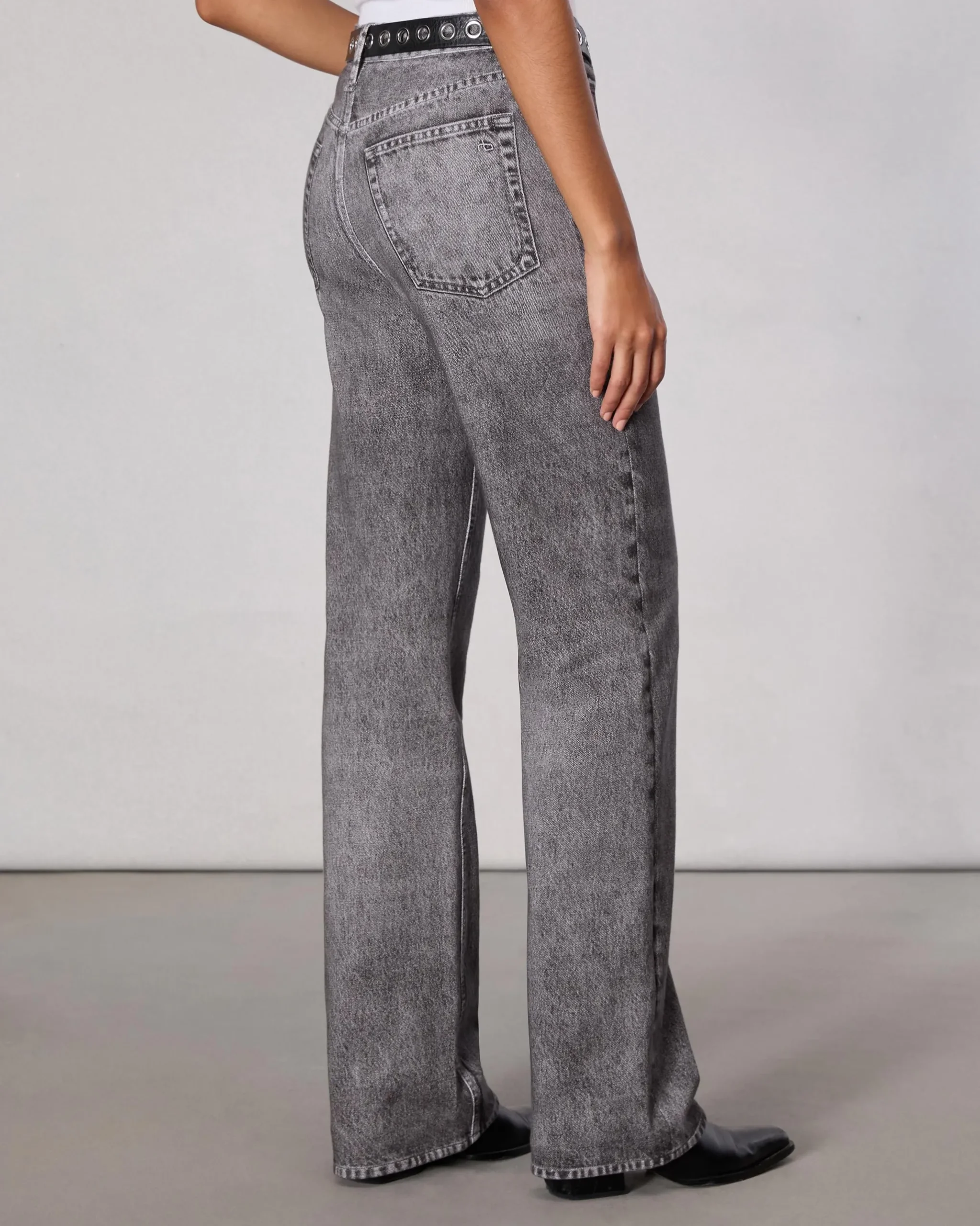 High rise, relaxed straight legSize 26: 12″ front rise, 30″ inseam, 19″ leg opening
