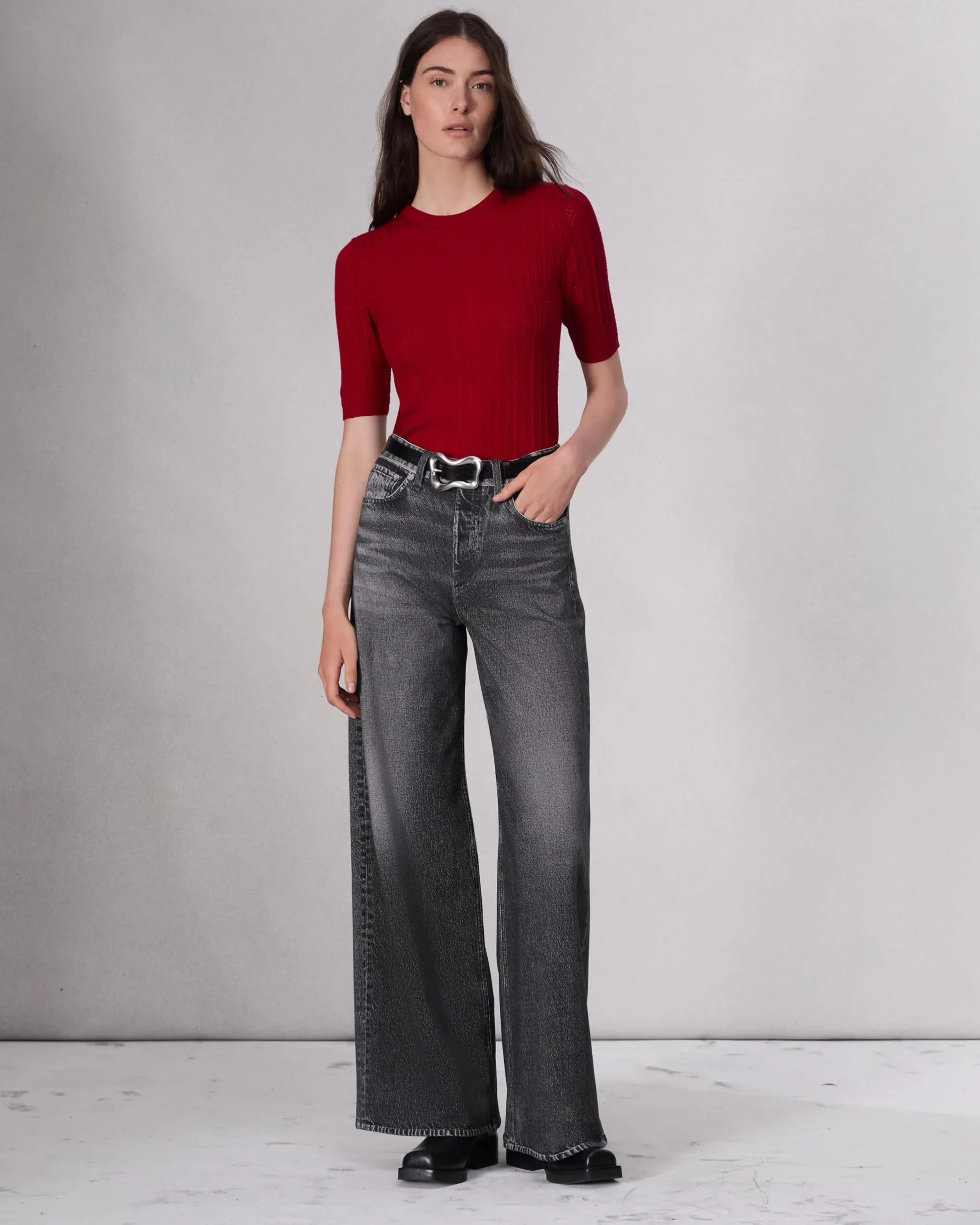 High-rise, wide-leg, full lengthSize 26: 12 3/8″ rise, 34″ inseam, 25 1/2″ leg openingModel is 5’10.5″ wearing a size 25