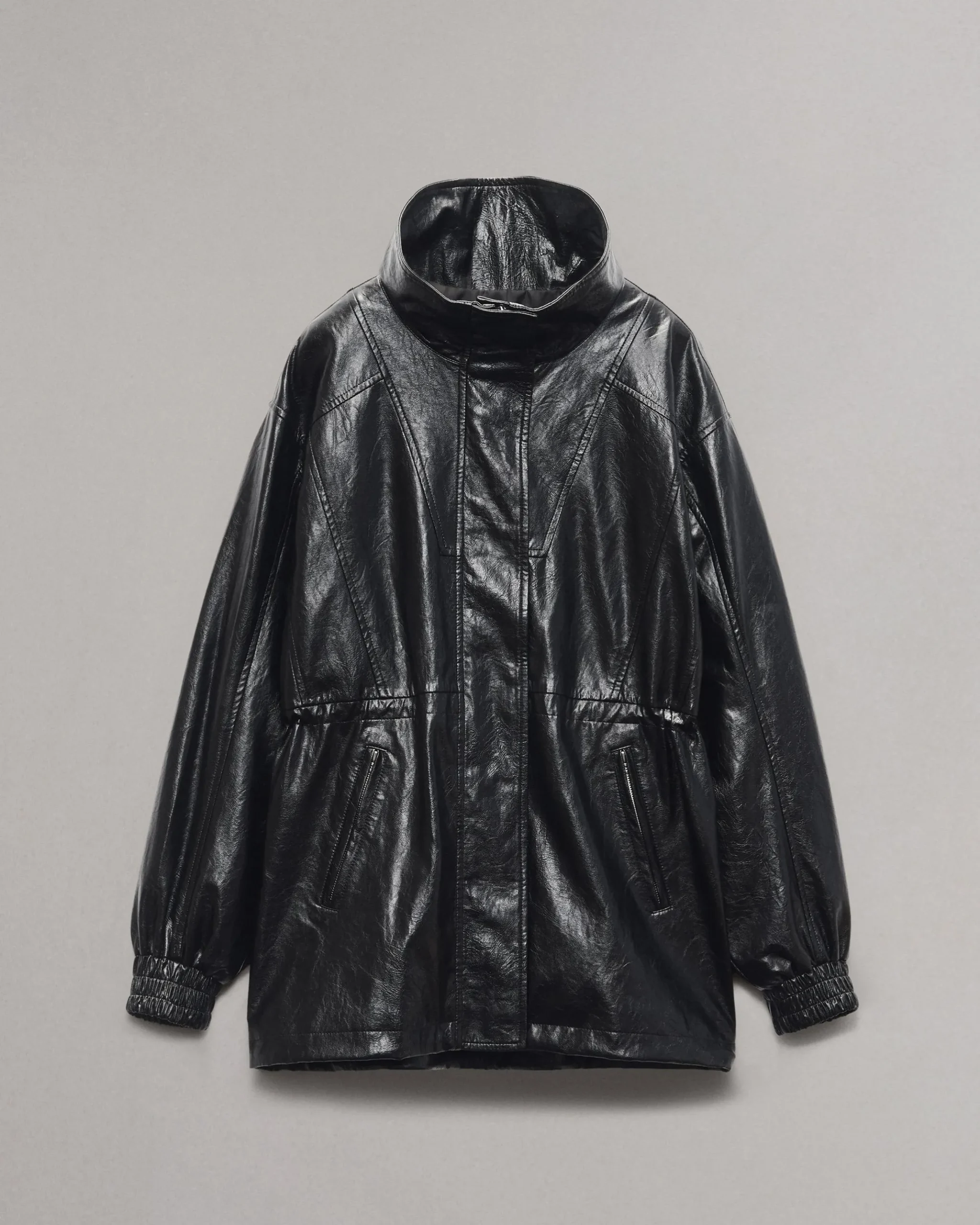 Inspired by vintage sportswear, this oversized jacket is fashioned from faux leather with a subtle sheen and a crinkled, lived-in look. Details like the hidden zip- and snap-up front and neck, elastic cuffs, and adjustable drawstring waist give you endless ways to wear it.