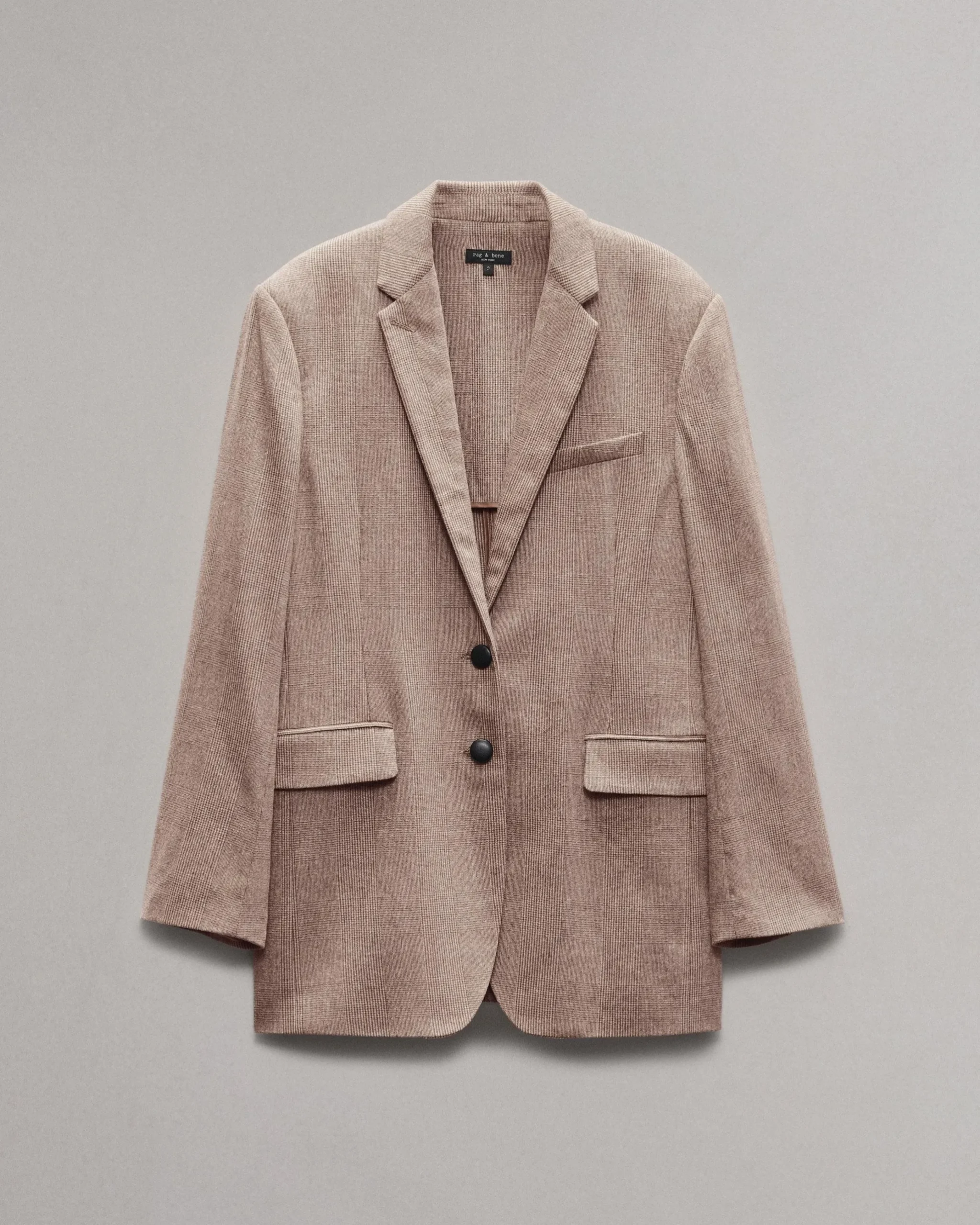 The new wardrobe essential. This take on the season’s oversized blazer is tailored from soft stretch wool with an understated glen plaid pattern. Its visual texture is complemented by faux leather buttons.
