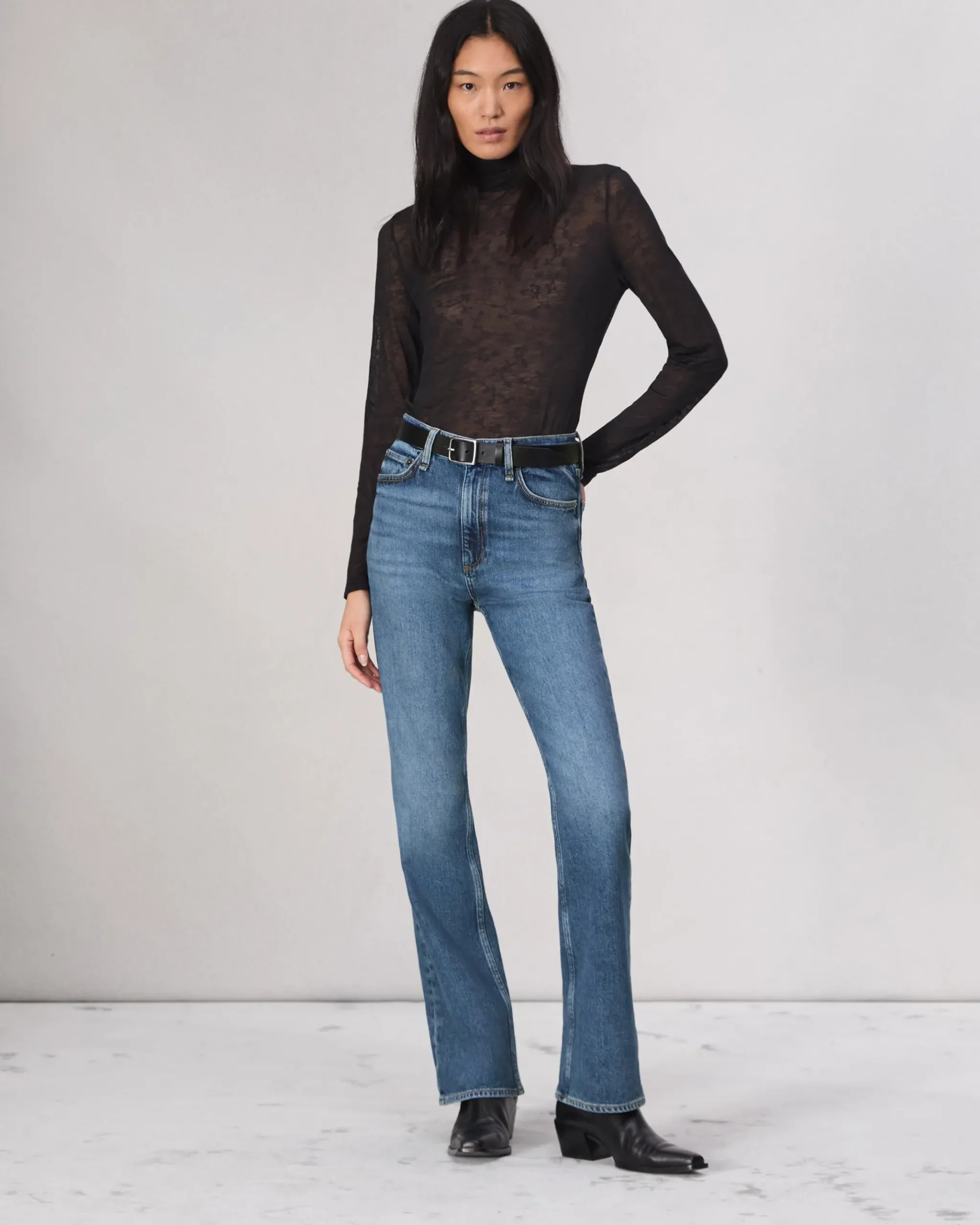 High-rise, bootcut, full length Size 26 : 11 1/2″ front rise, 32″ inseam, 18 1/4″ leg openingModel is 5’10” wearing size 25