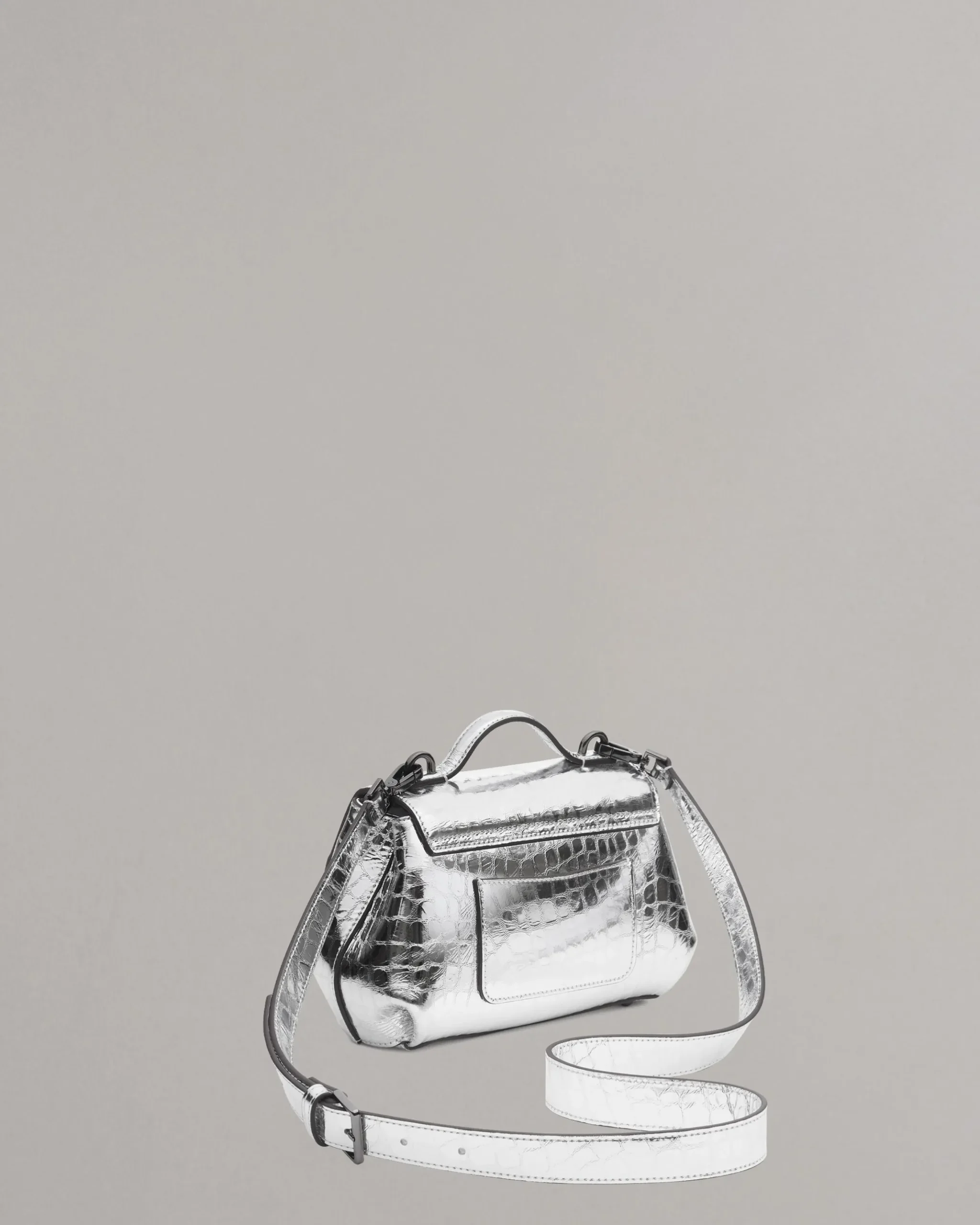 A delightful, compact version of the quintessential flap bag. This petite, structured style is crafted from metallic, crocodile-embossed leather milled in Italy and punctuated by sleek metal bars. The top handle and adjustable strap allow you to carry it by hand or over your shoulder, while the back patch pocket offers quick access to cards.