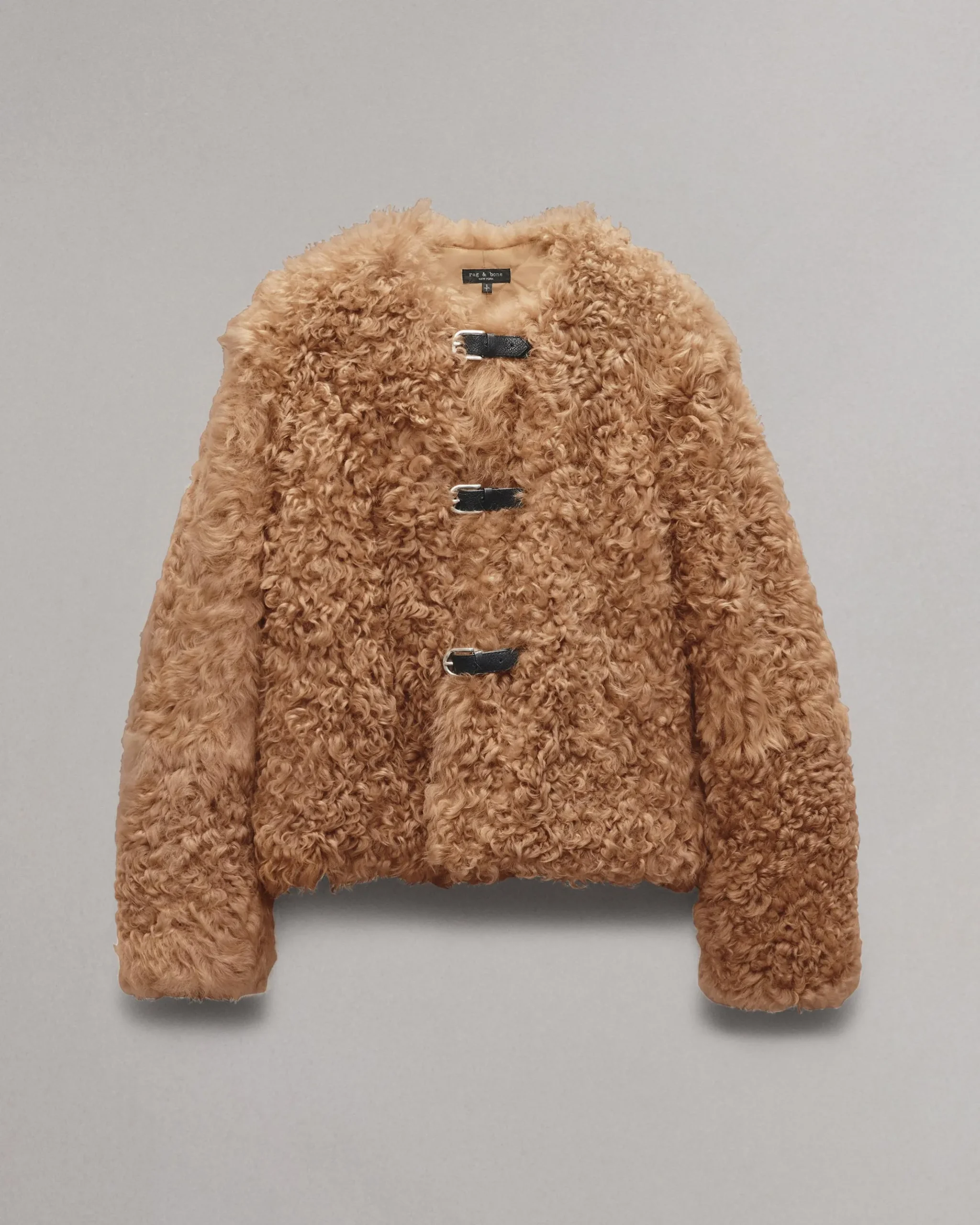 Curly, ultra-soft lamb shearling defines this standout collarless jacket, which is tailored for a slightly boxy silhouette that hits just below the waist. Leather buckles at the front create an intriguing contrast, whether worn open or closed.