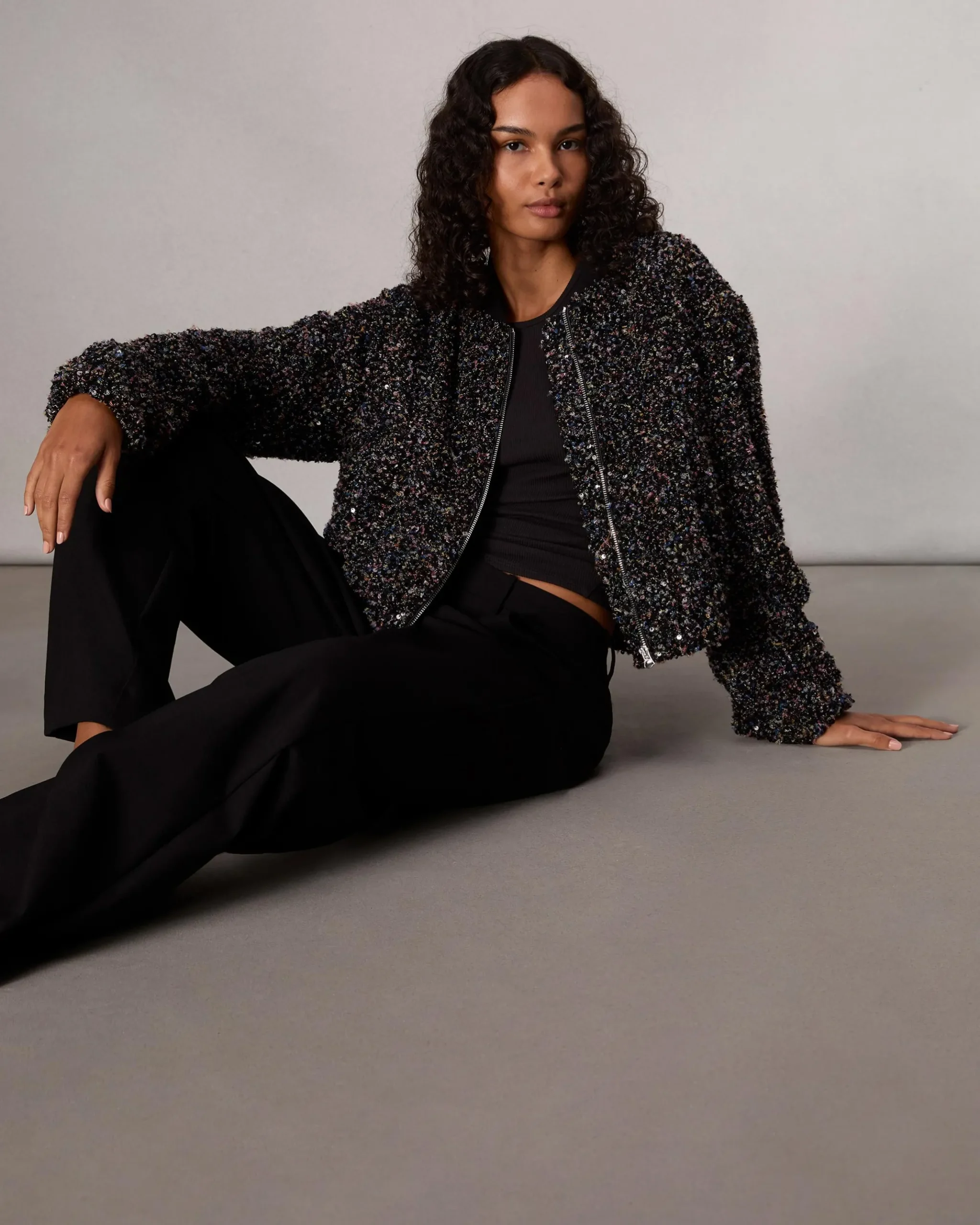 Black boucle tweed densely woven with tonal sequins and multicolored threads transforms this slightly cropped bomber jacket into statement-making streetwear for the season ahead. It’s finished with side slip pockets and lightly filled for additional warmth.