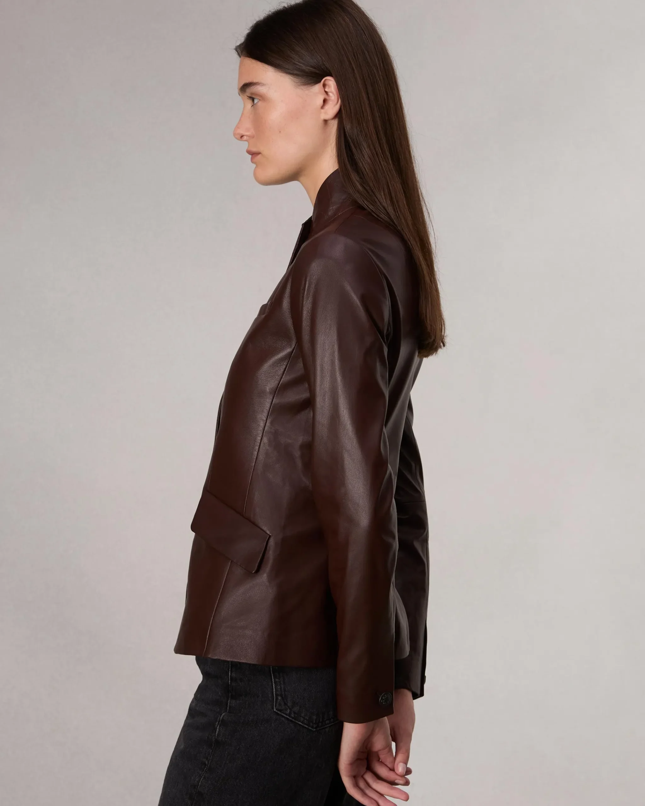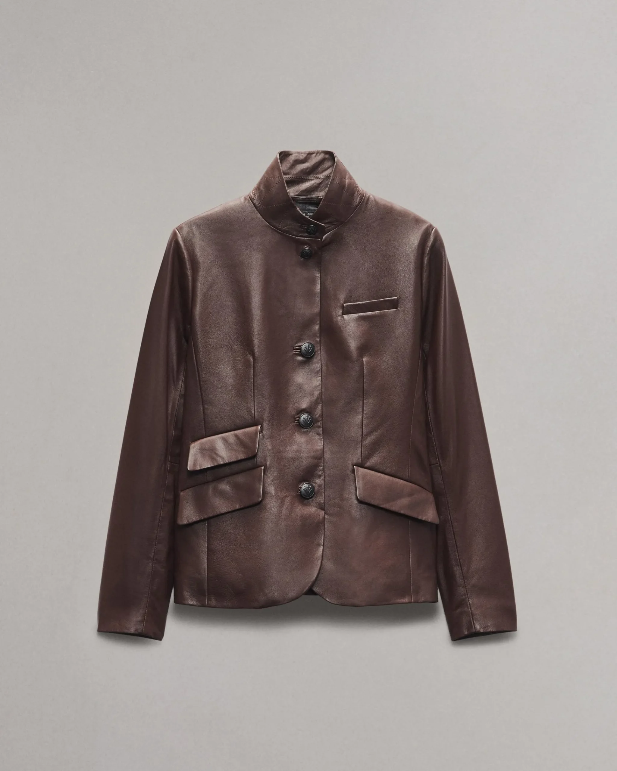 A rag & bone favorite. Crafted from buttery lamb leather with a classic, tailored fit. Featuring a stand collar, this style perfectly blends the refinement of a blazer with the utility of a military jacket. Complete with signature dagger buttons down the front.
