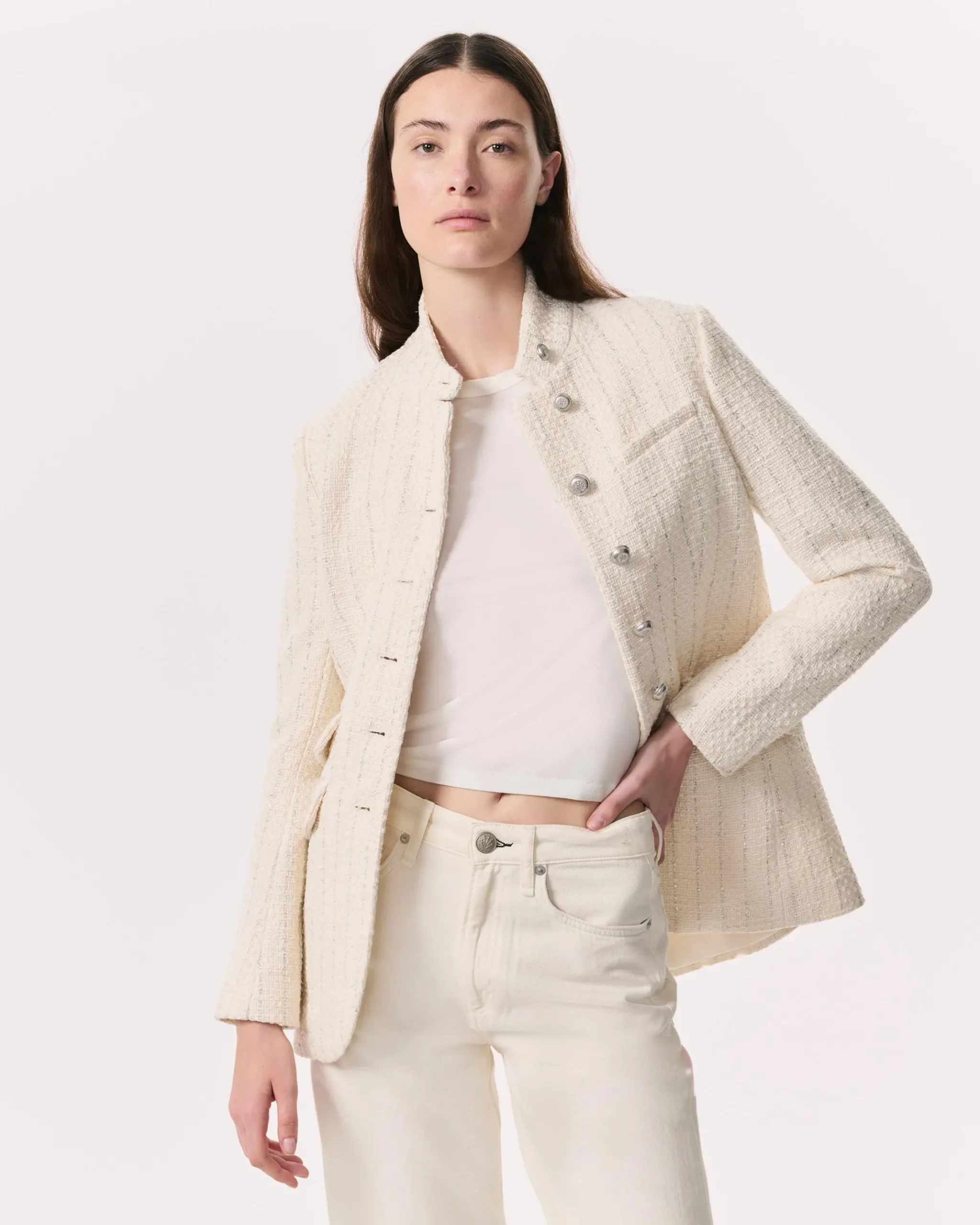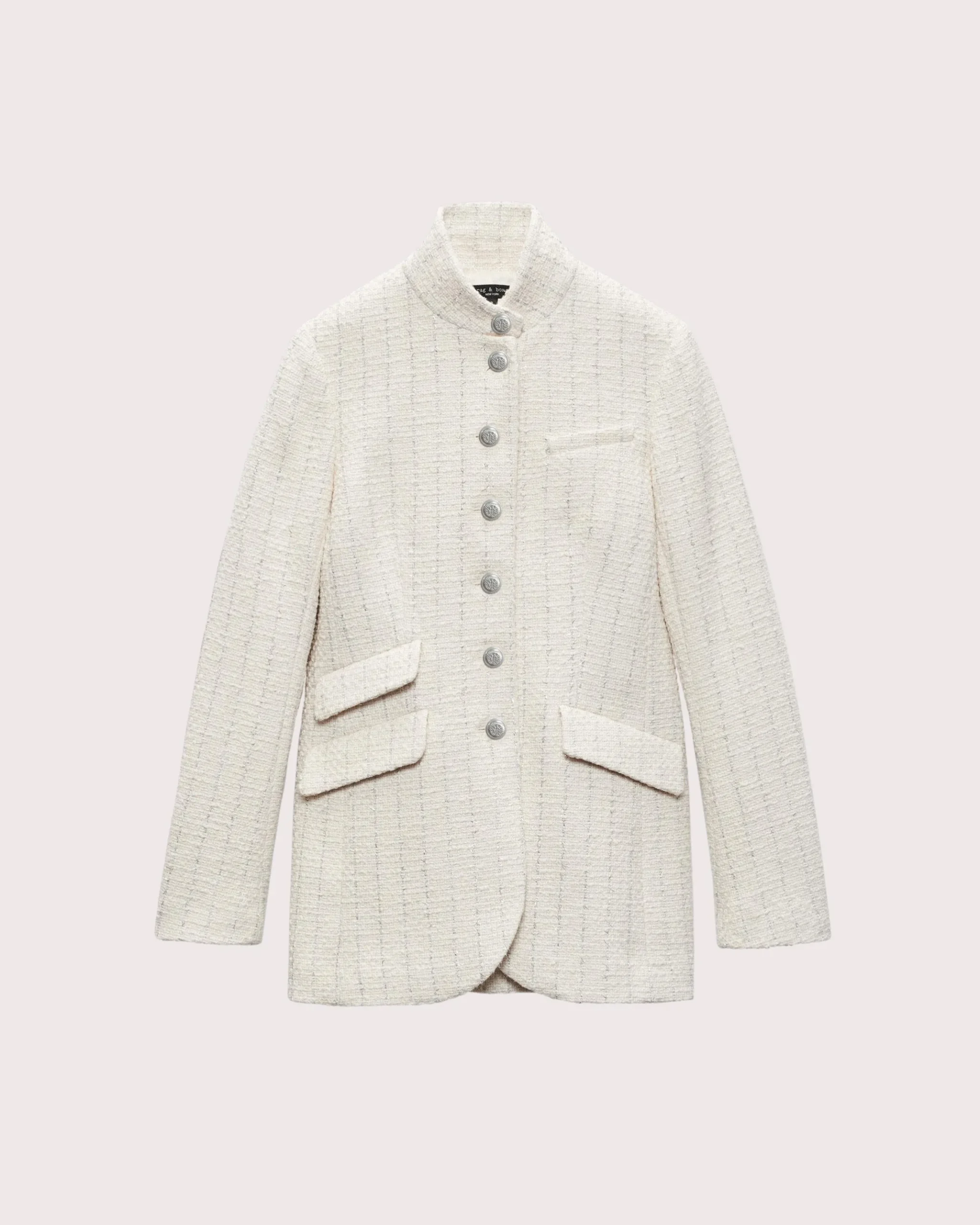 A rag & bone favorite. Crafted from a cotton-blend tweed with metallic silver stripes. Featuring a stand collar, this longer, slim-fit style perfectly blends the refinement of a blazer with the utility of a military jacket. Complete with braid-embossed metal buttons down the front.