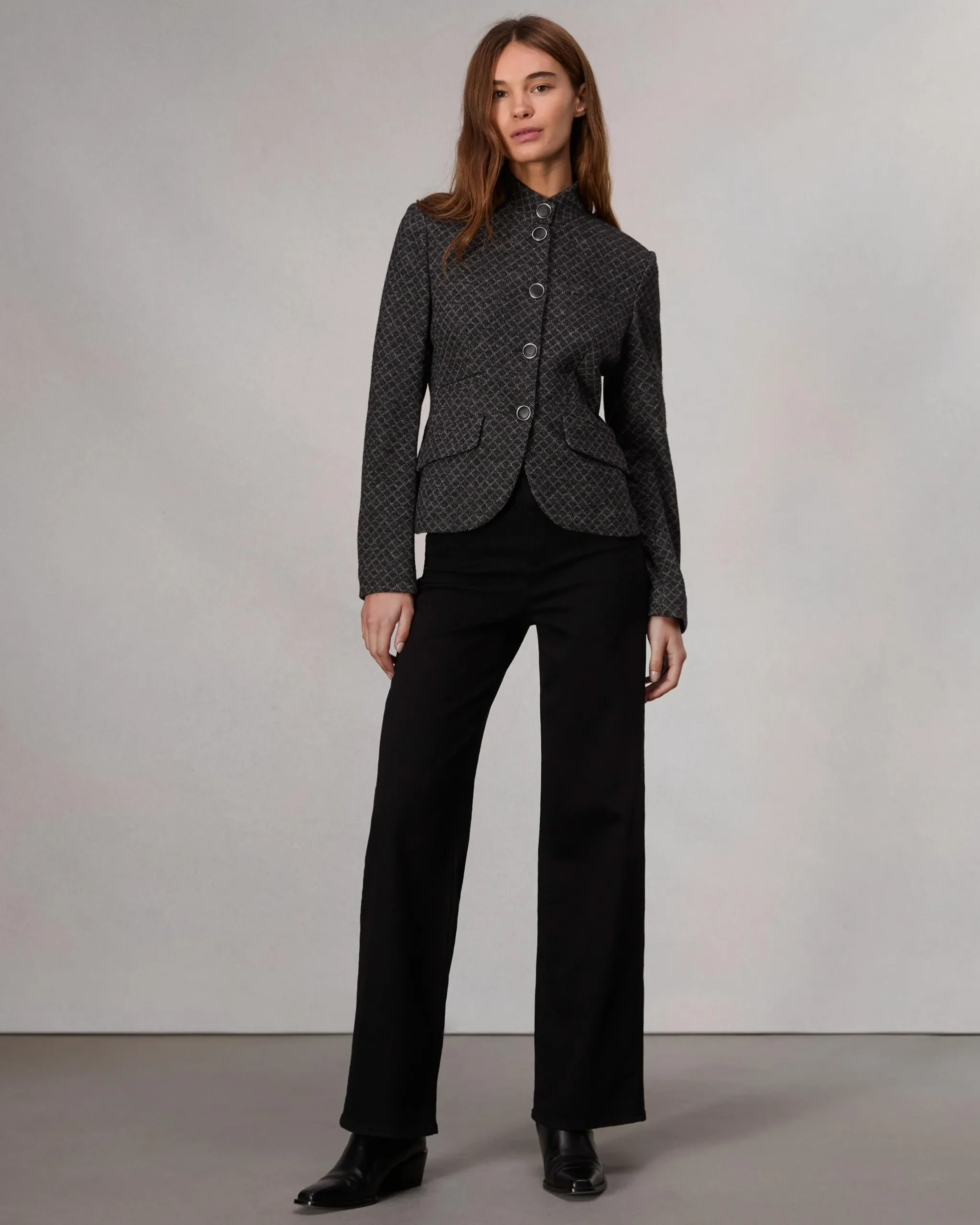 A rag & bone favorite. Jacquard-knit from an Italian-milled diamond-patterned cloth. Featuring a stand collar, this slightly cropped, slim-fit style perfectly blends the refinement of a blazer with the utility of a military jacket. Complete with metal-rimmed buttons down the front.