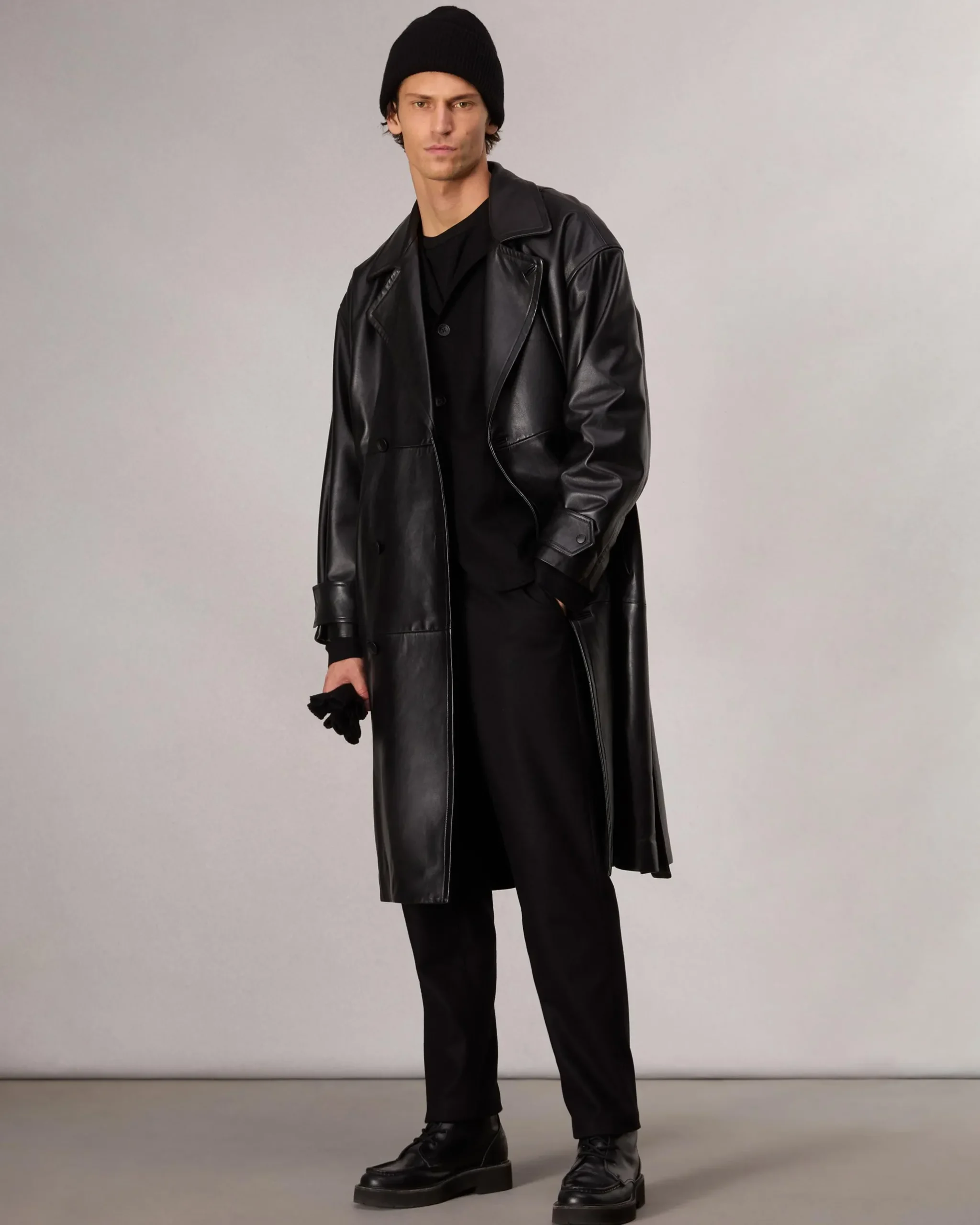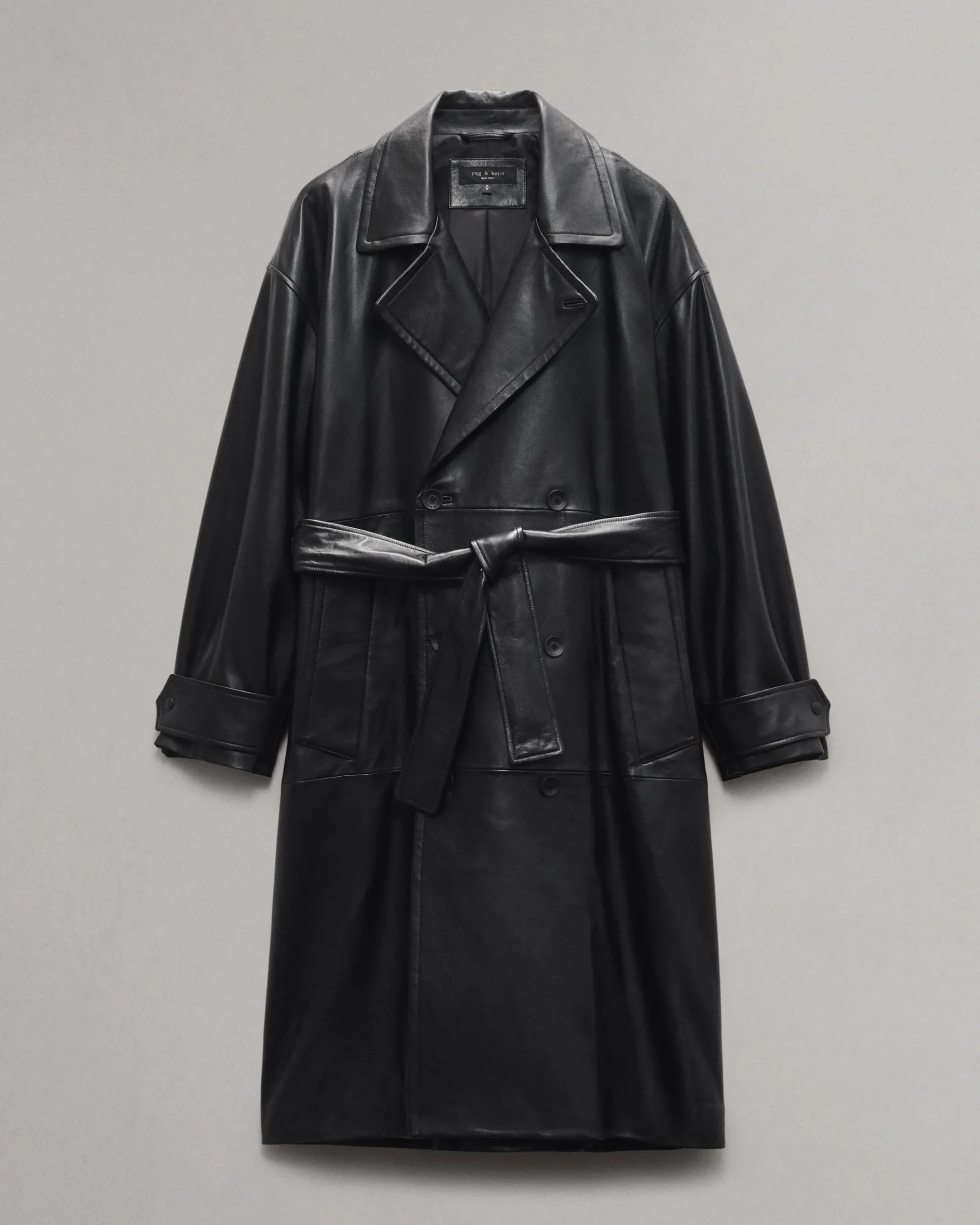 Outerwear at its finest. Expertly crafted from buttery-soft lamb leather, this double-breasted trench coat takes any outfit to the next level. Fine-tune its statement-making, oversized fit with the removable belt.