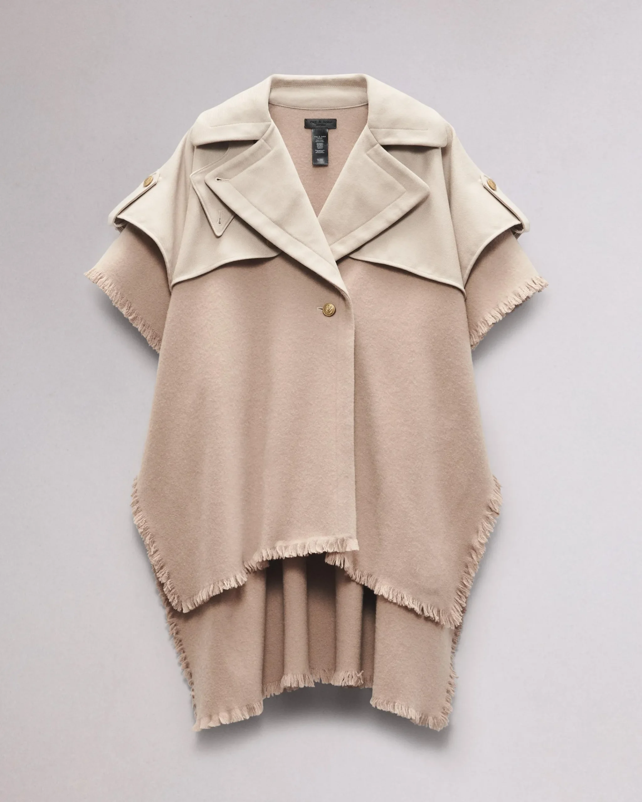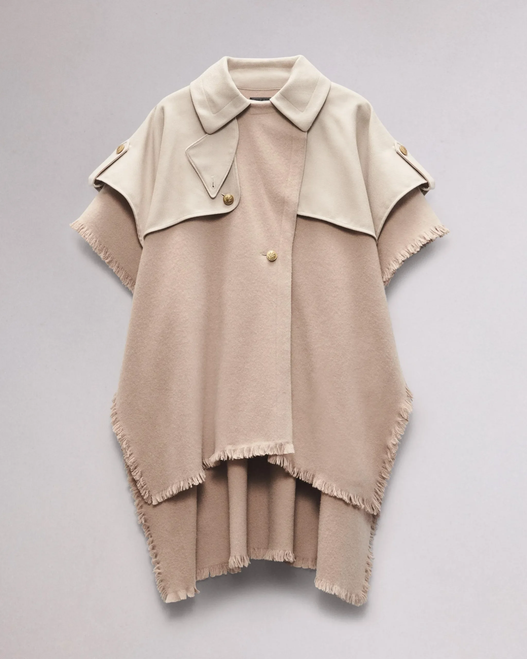 The Trench Poncho. The perfect hybrid. Crafted in wool twill, our poncho is secured with our signature metal dagger buttons, storm flaps and epaulettes that give a nod to the quintessential trench coat.